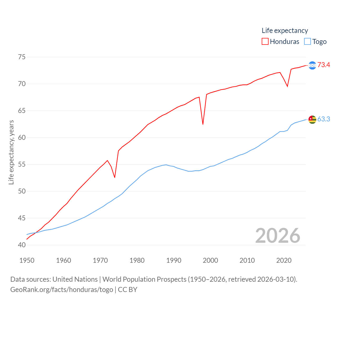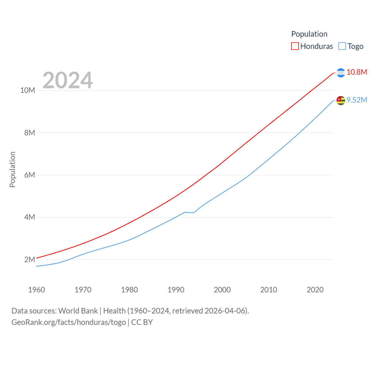 Honduras has a population of 10.8M (ranked 89/197), compared with 9.52M in Togo (ranked 98/197). Honduras' land area is 43,201 sq mi versus 21,000 sq mi for Togo (ranked 100th vs. 124th).