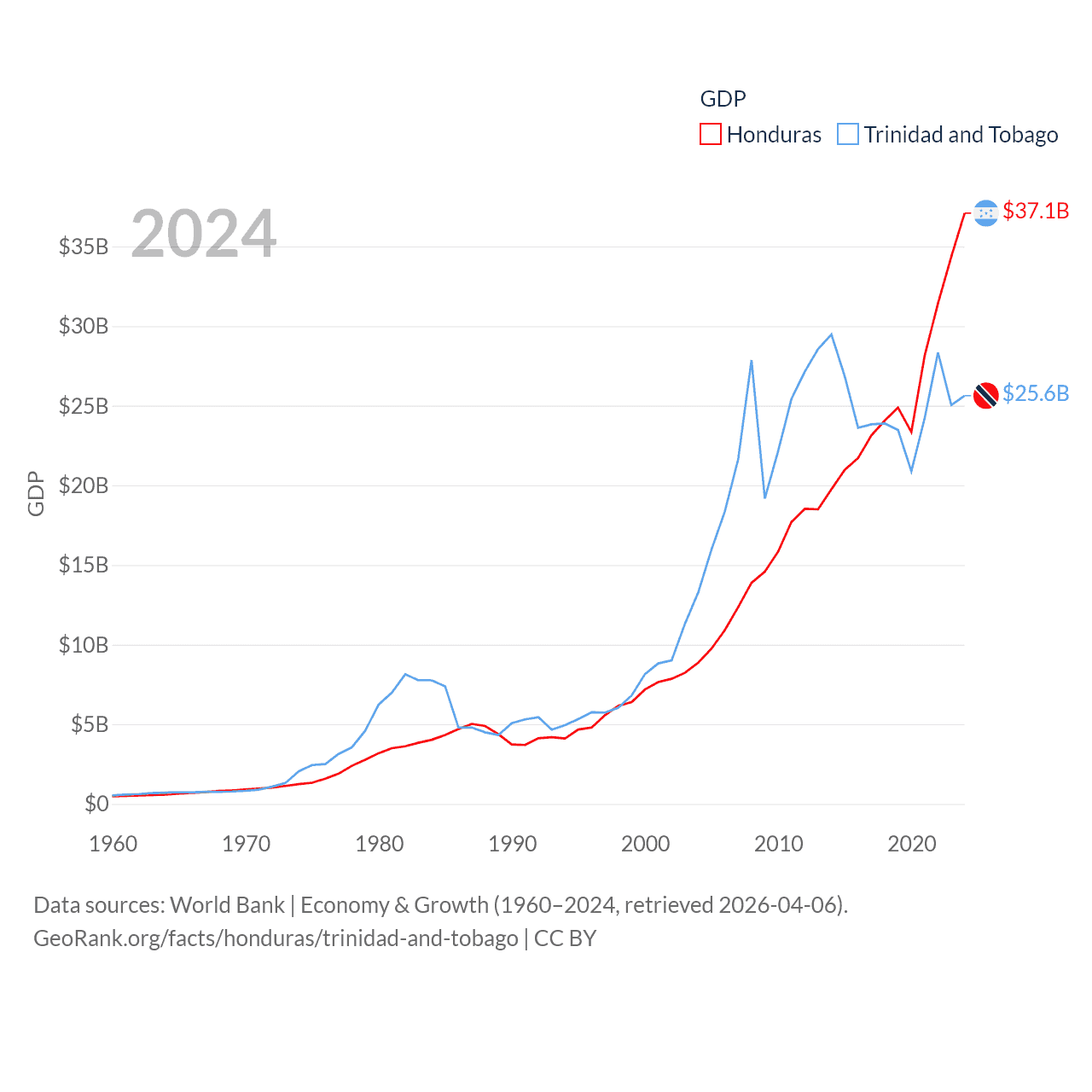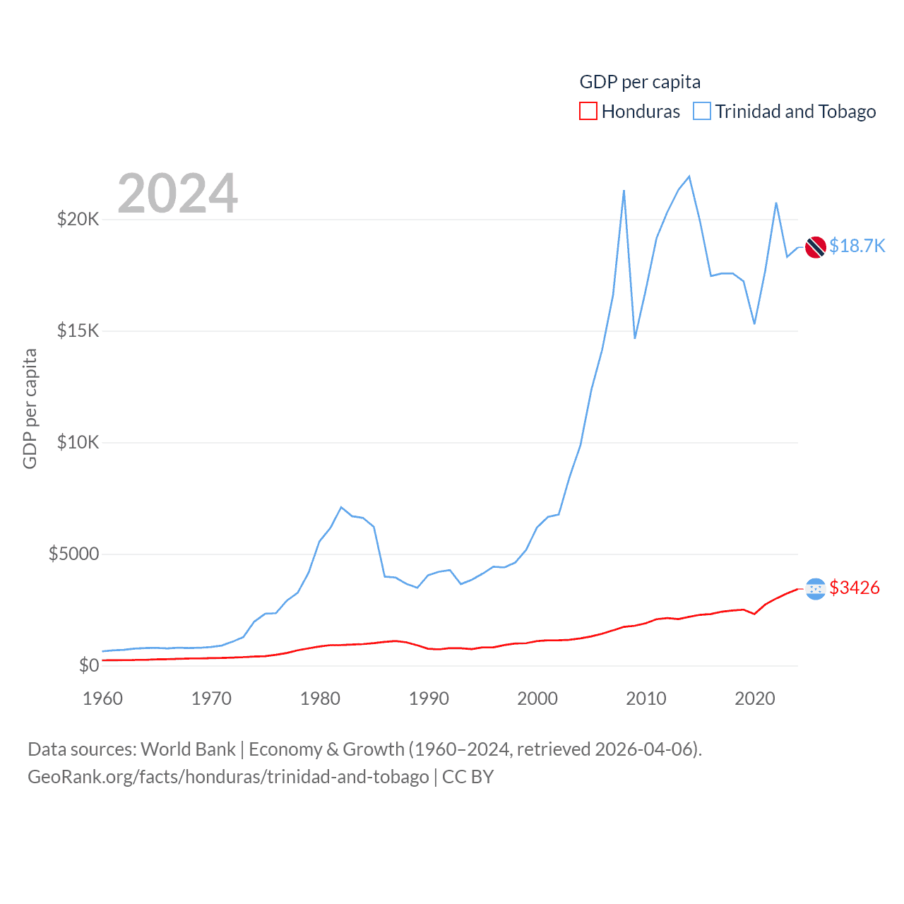 By GDP, Honduras ranks 104/197 ($37.1B) and Trinidad and Tobago ranks 115/197 ($25.6B). By GDP per capita, Honduras ranks 136/197 ($3,426), while Trinidad and Tobago ranks 61/197 ($18,733).