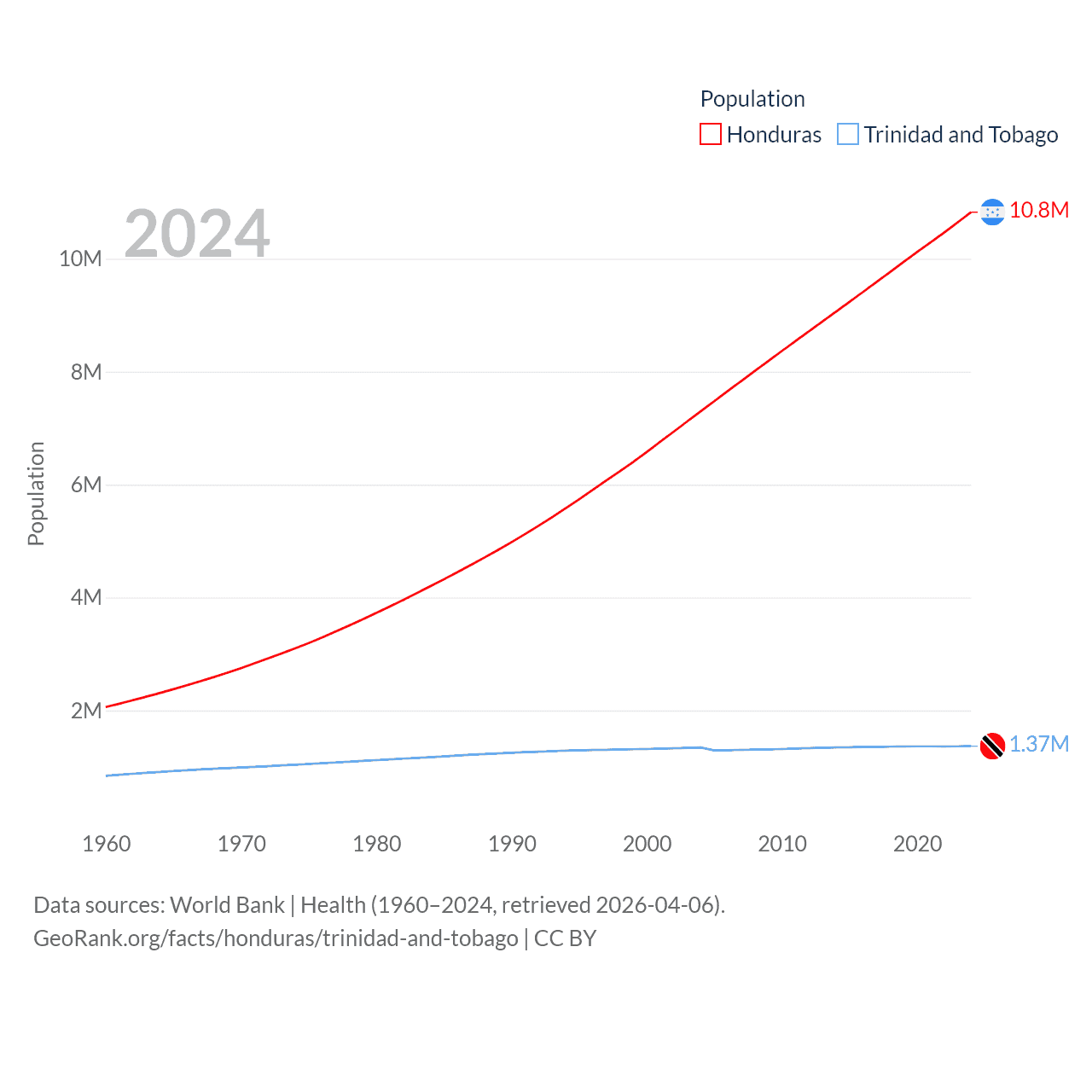 Honduras has a population of 10.8M (ranked 89/197), compared with 1.37M in Trinidad and Tobago (ranked 154/197). Honduras' land area is 43,201 sq mi versus 1,981 sq mi for Trinidad and Tobago (ranked 100th vs. 166th).