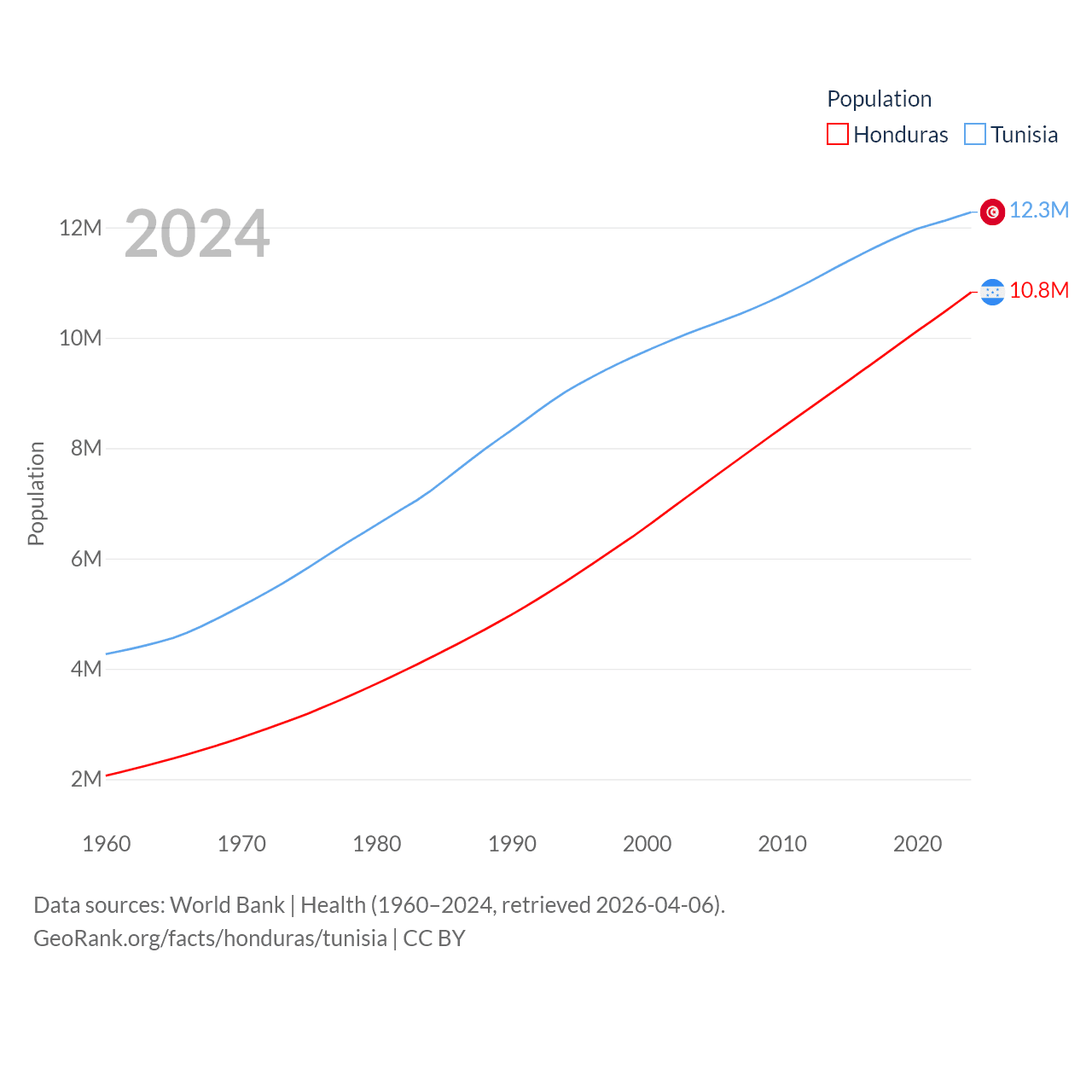 Honduras has a population of 10.8M (ranked 89/197), compared with 12.3M in Tunisia (ranked 80/197). Honduras' land area is 43,201 sq mi versus 59,985 sq mi for Tunisia (ranked 100th vs. 91st).