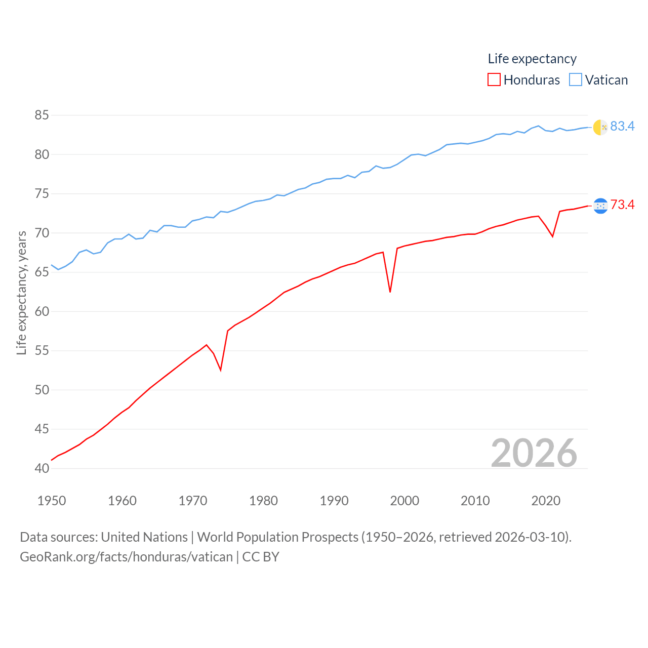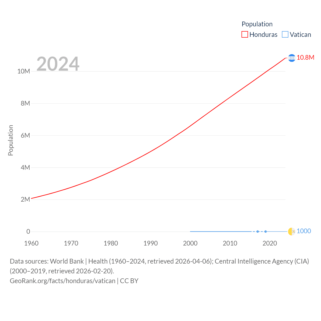 Honduras has a population of 10.8M (ranked 89/197), compared with 1K in The Vatican (ranked 197/197). Honduras' land area is 43,201 sq mi versus 0.17 sq mi for The Vatican (ranked 100th vs. 197th).