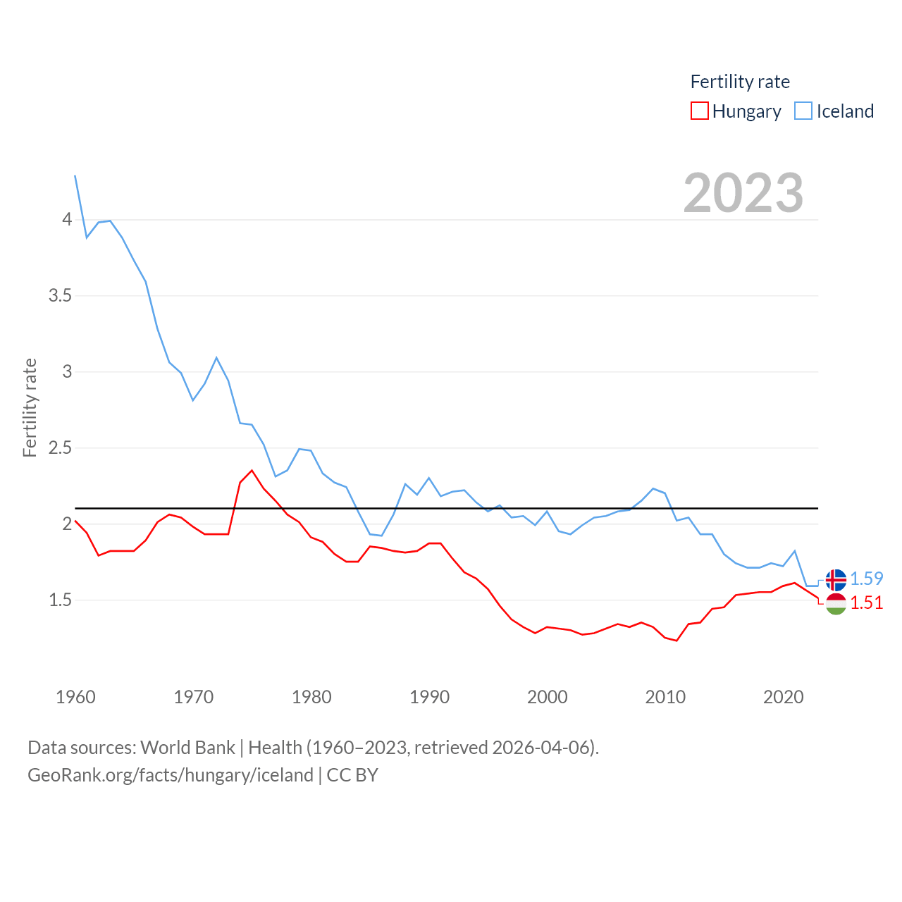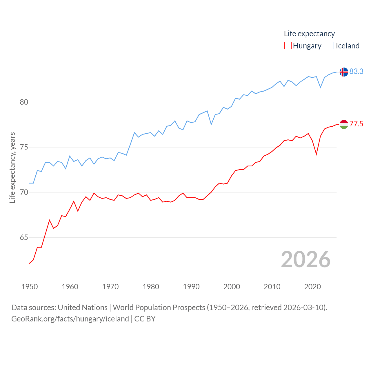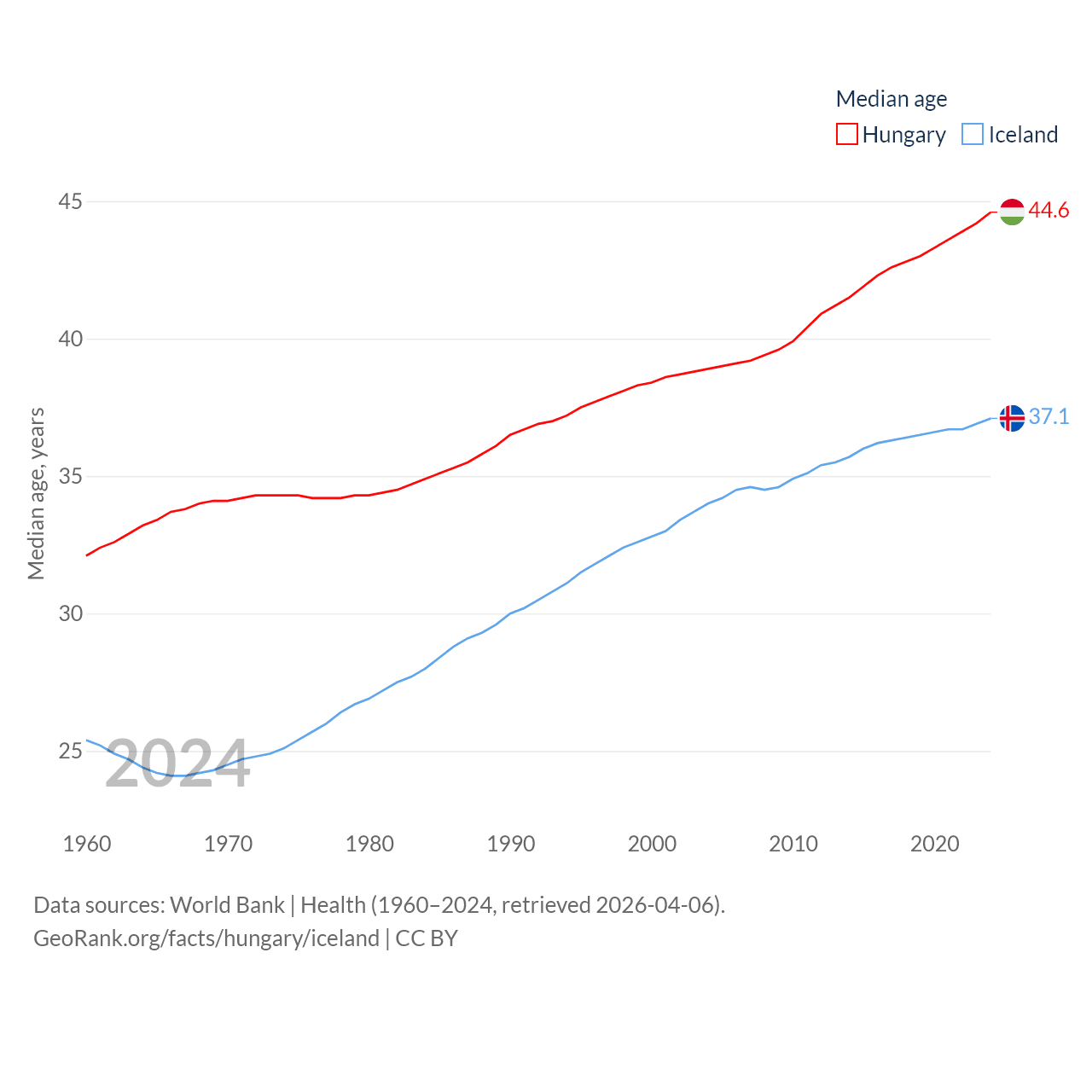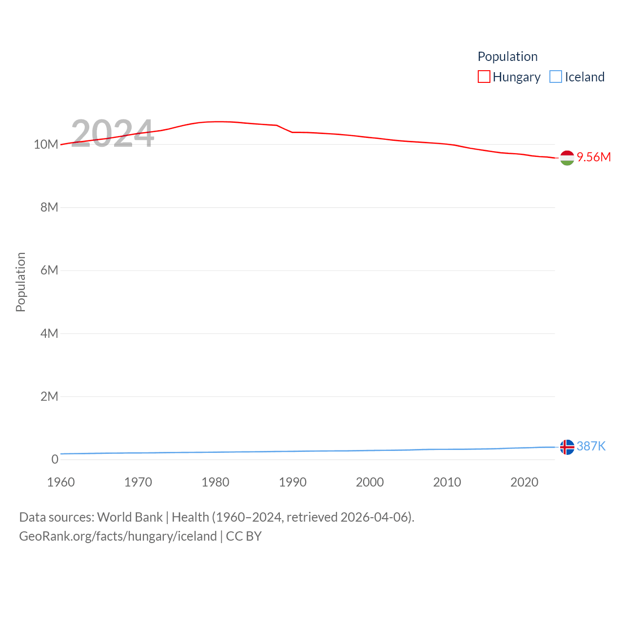 Hungary has a population of 9.56M (ranked 97/197), compared with 387K in Iceland (ranked 173/197). Hungary's land area is 35,236 sq mi versus 38,931 sq mi for Iceland (ranked 109th vs. 104th).
