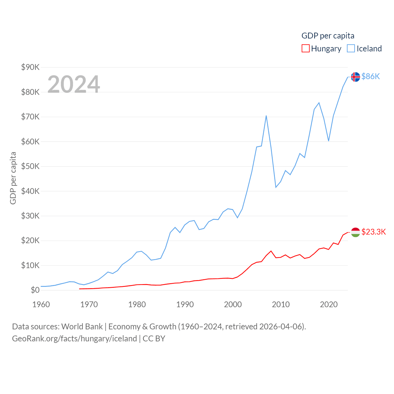 By GDP, Hungary ranks 55/197 ($223B) and Iceland ranks 108/197 ($33.3B). By GDP per capita, Hungary ranks 55/197 ($23,292), while Iceland ranks 9/197 ($86,041).