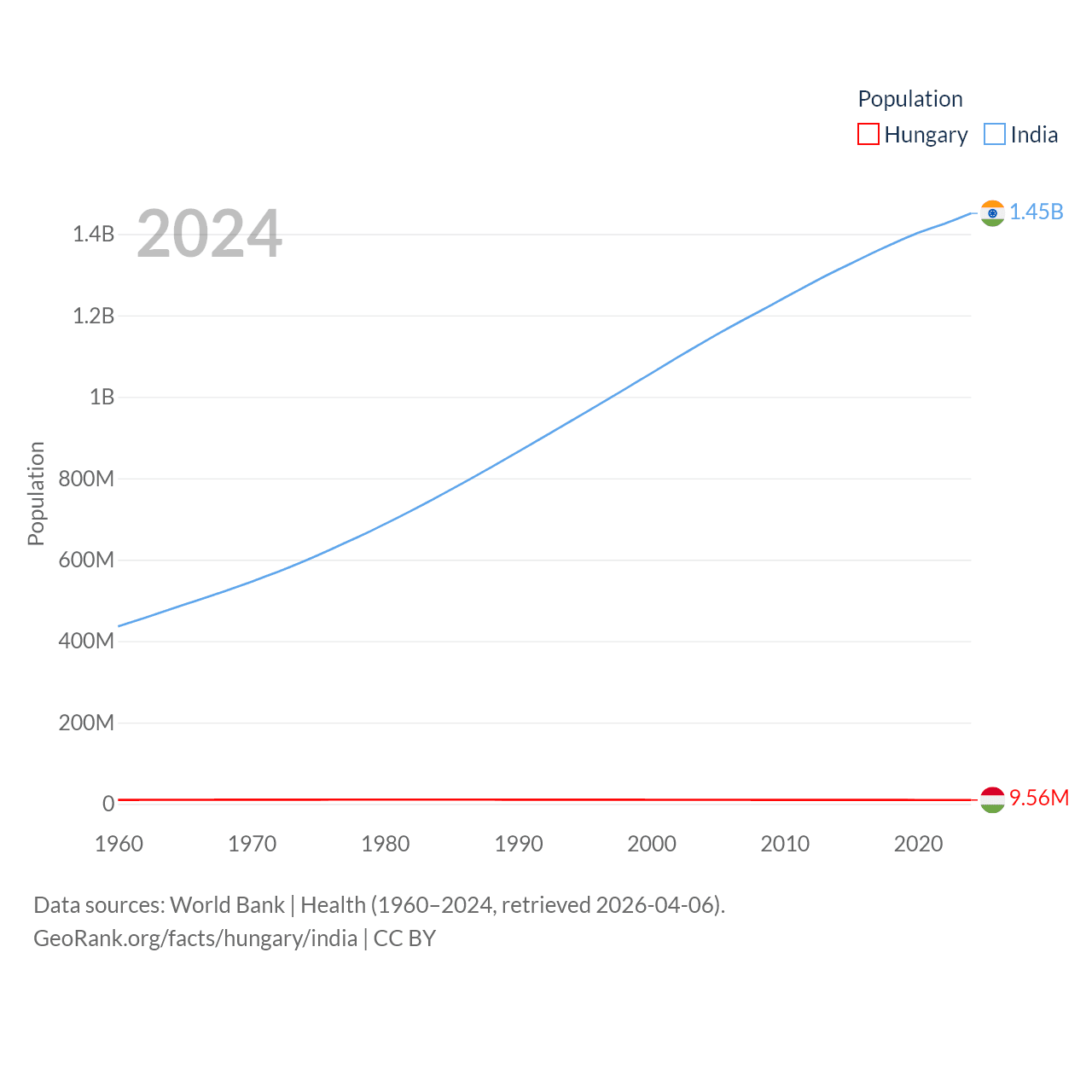 Hungary has a population of 9.56M (ranked 97/197), compared with 1.45B in India (ranked 1/197). Hungary's land area is 35,236 sq mi versus 1,147,955 sq mi for India (ranked 109th vs. 7th).