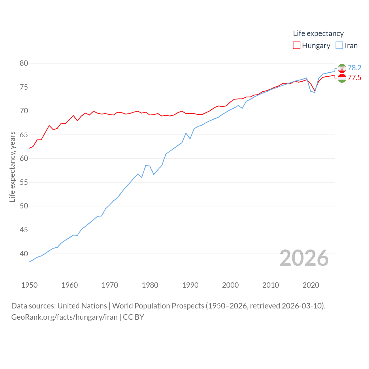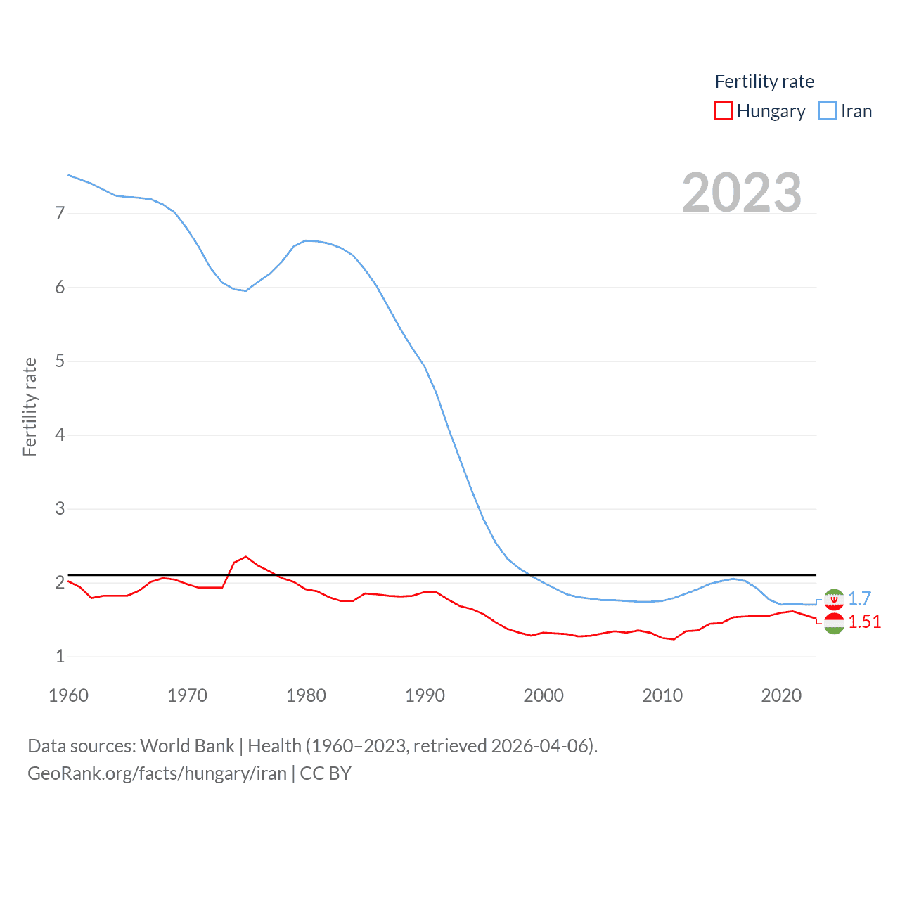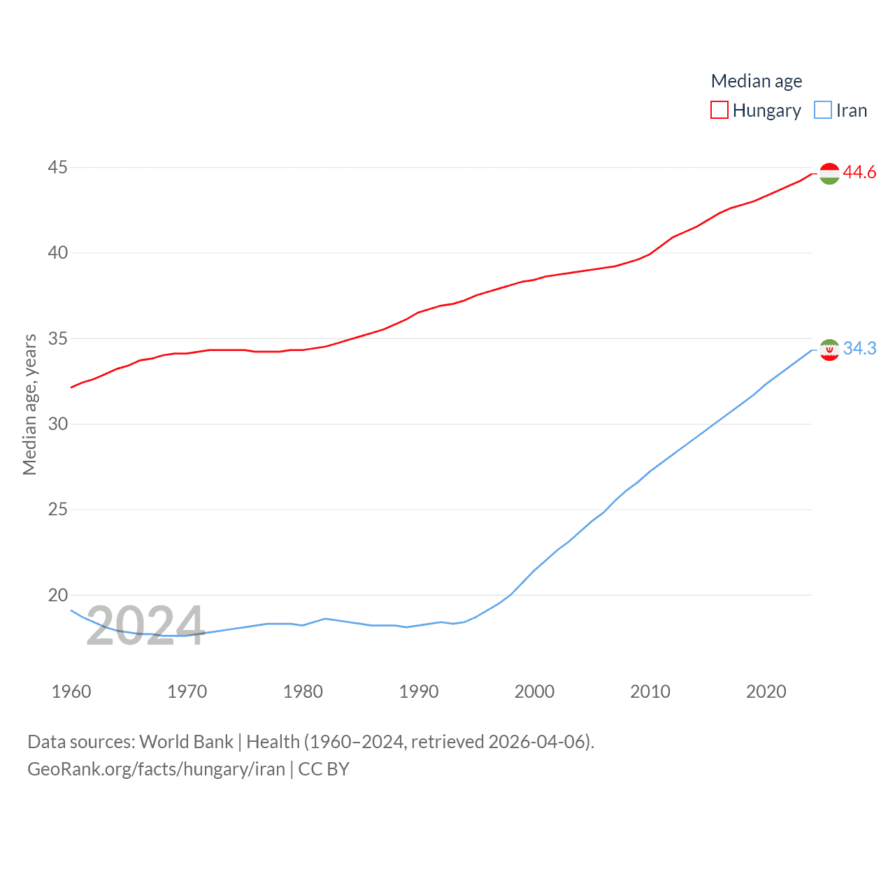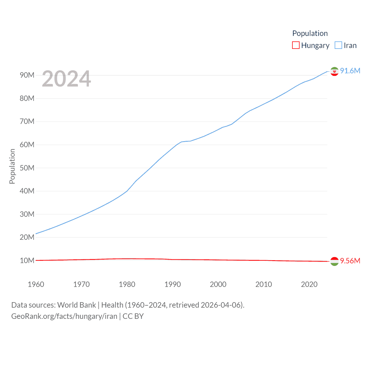 Hungary has a population of 9.56M (ranked 97/197), compared with 91.6M in Iran (ranked 17/197). Hungary's land area is 35,236 sq mi versus 626,451 sq mi for Iran (ranked 109th vs. 17th).