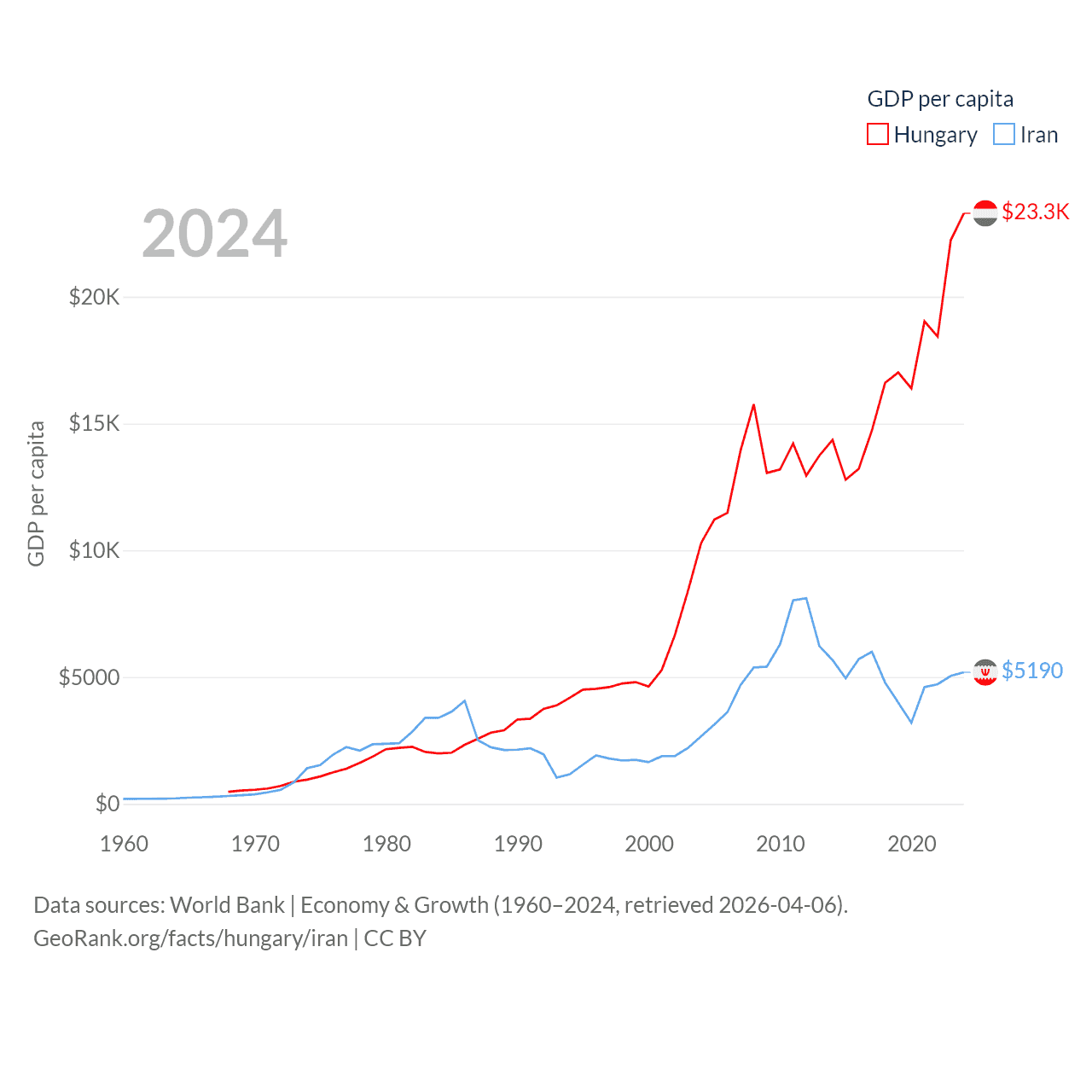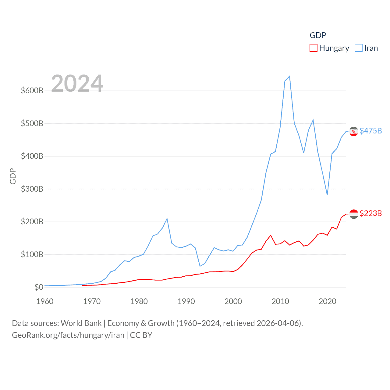 By GDP, Hungary ranks 55/197 ($223B) and Iran ranks 34/197 ($475B). By GDP per capita, Hungary ranks 55/197 ($23,292), while Iran ranks 119/197 ($5,190).
