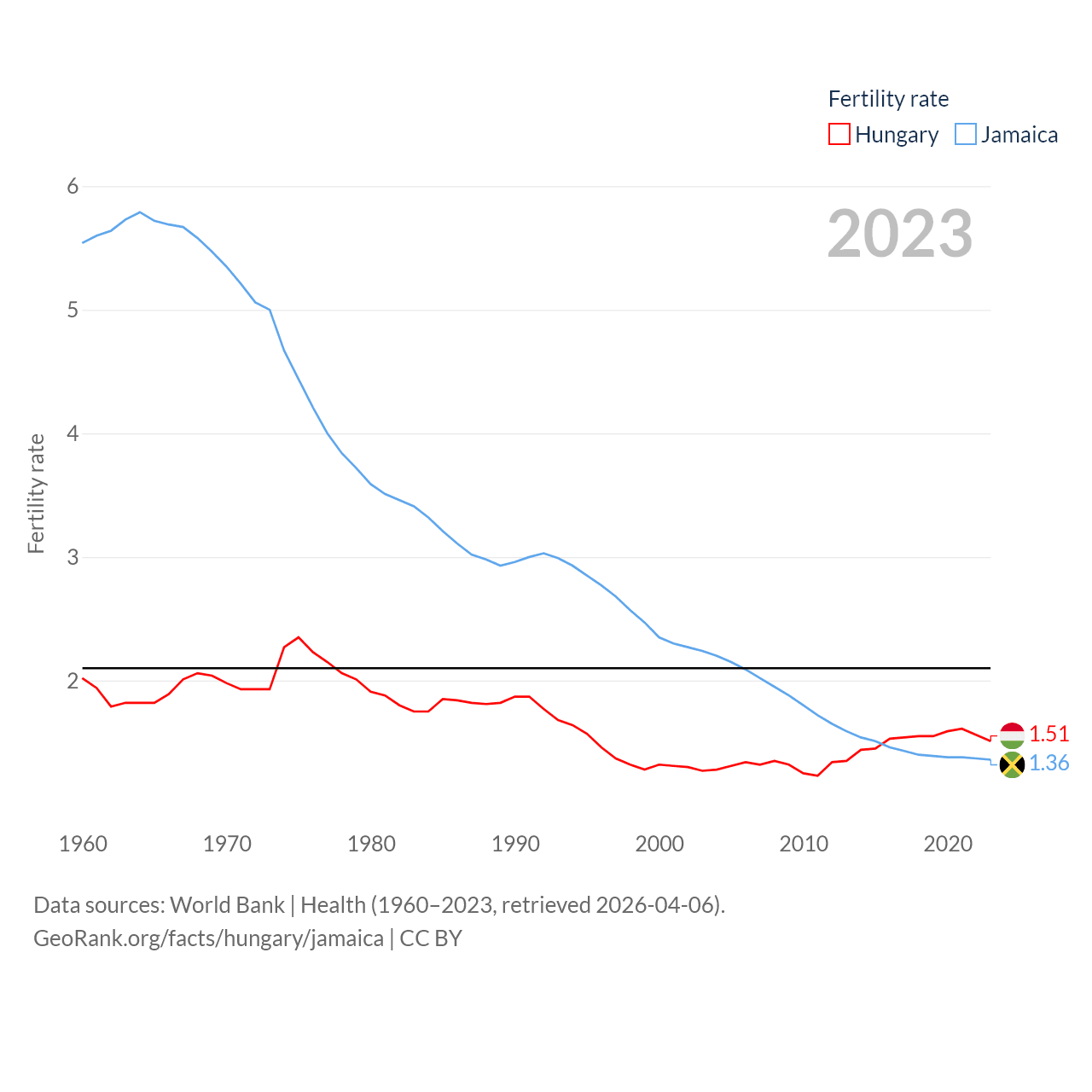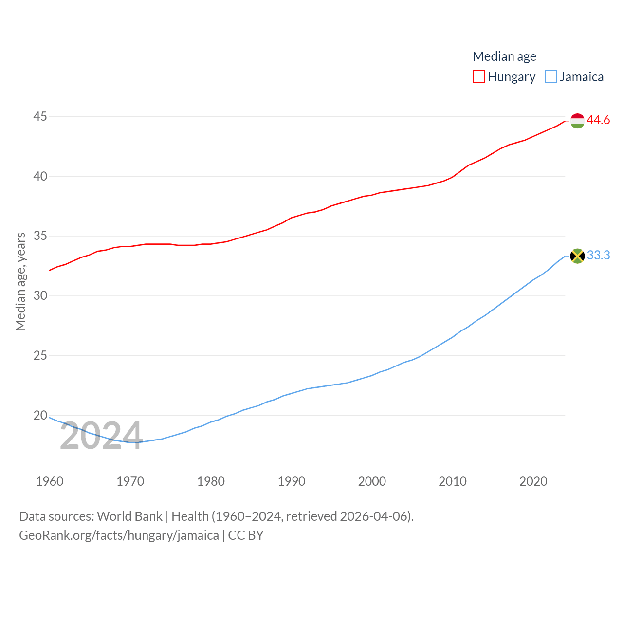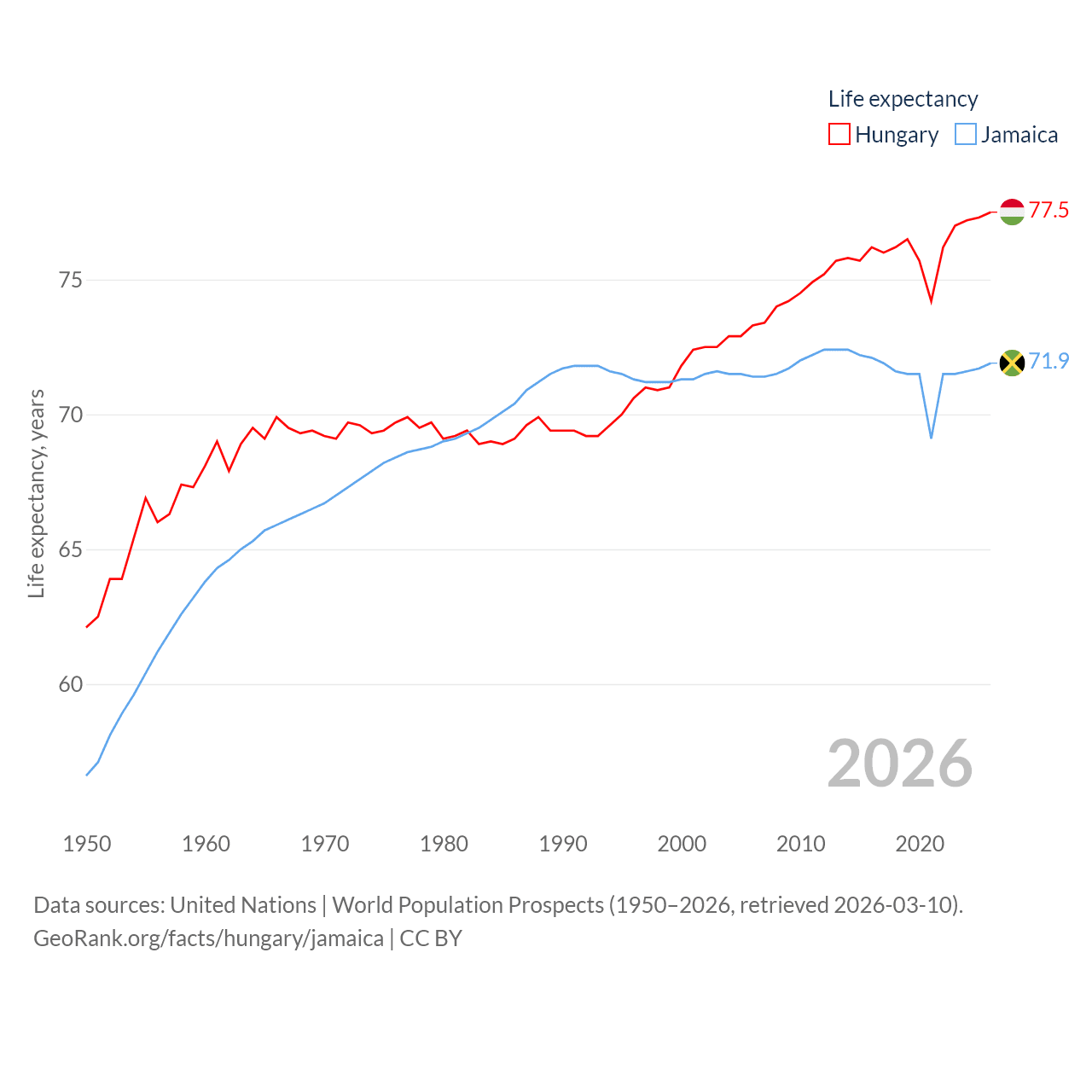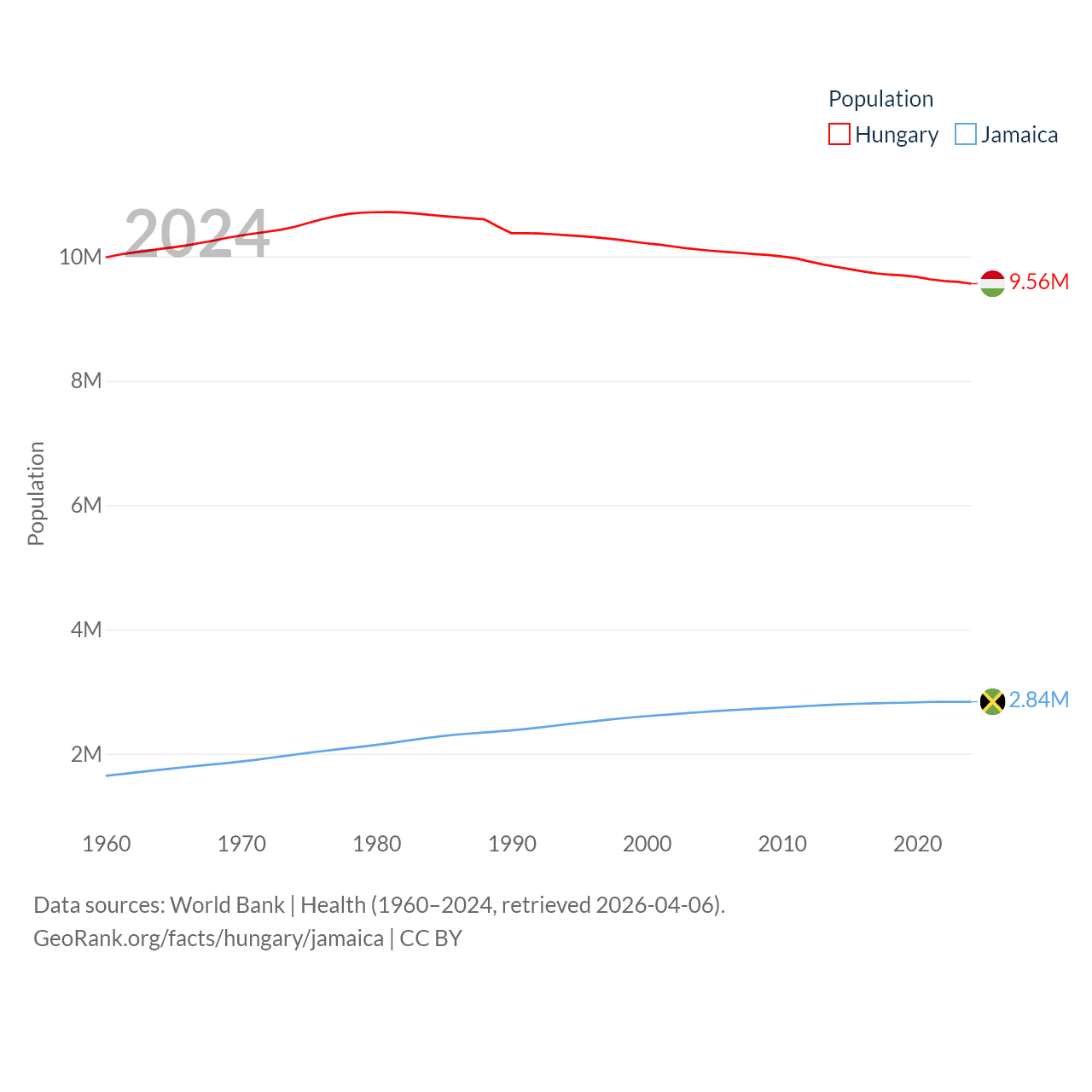 Hungary has a population of 9.56M (ranked 97/197), compared with 2.84M in Jamaica (ranked 139/197). Hungary's land area is 35,236 sq mi versus 4,181 sq mi for Jamaica (ranked 109th vs. 159th).