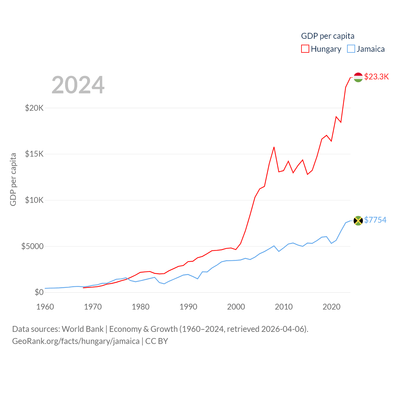 By GDP, Hungary ranks 55/197 ($223B) and Jamaica ranks 124/197 ($22B). By GDP per capita, Hungary ranks 55/197 ($23,292), while Jamaica ranks 95/197 ($7,754).