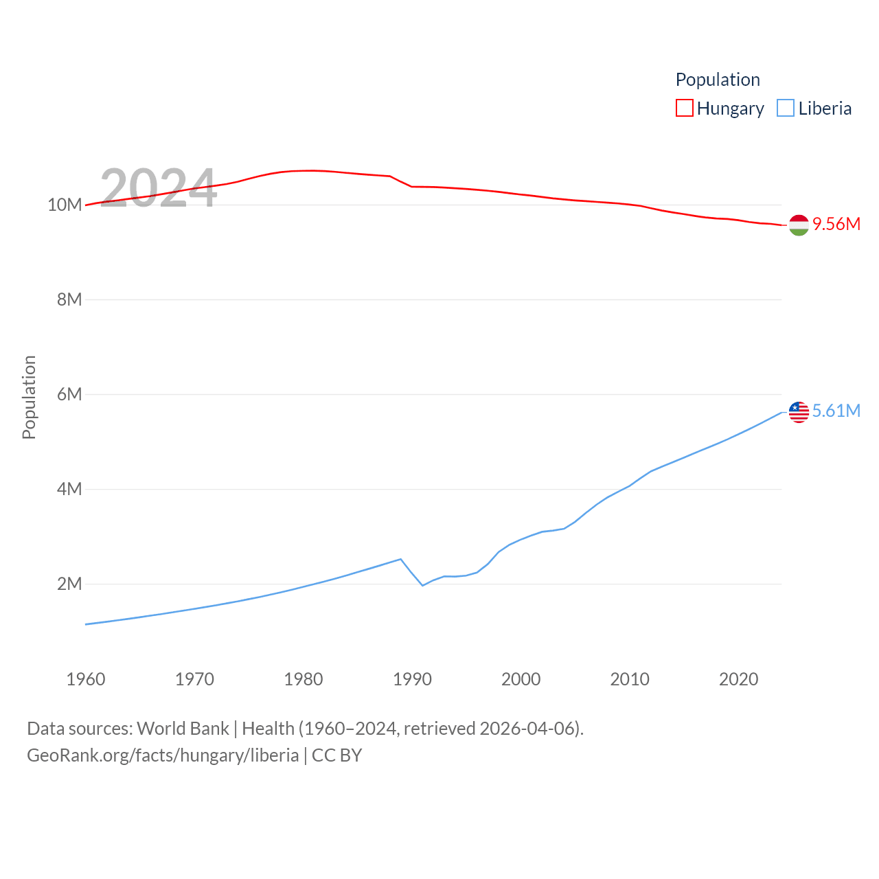 Hungary has a population of 9.56M (ranked 97/197), compared with 5.61M in Liberia (ranked 117/197). Hungary's land area is 35,236 sq mi versus 37,189 sq mi for Liberia (ranked 109th vs. 106th).