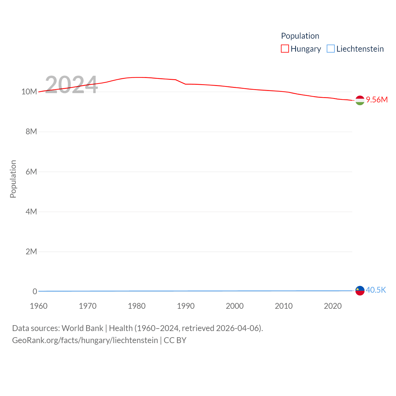 Hungary has a population of 9.56M (ranked 97/197), compared with 40.4K in Liechtenstein (ranked 190/197). Hungary's land area is 35,236 sq mi versus 61.8 sq mi for Liechtenstein (ranked 109th vs. 192nd).
