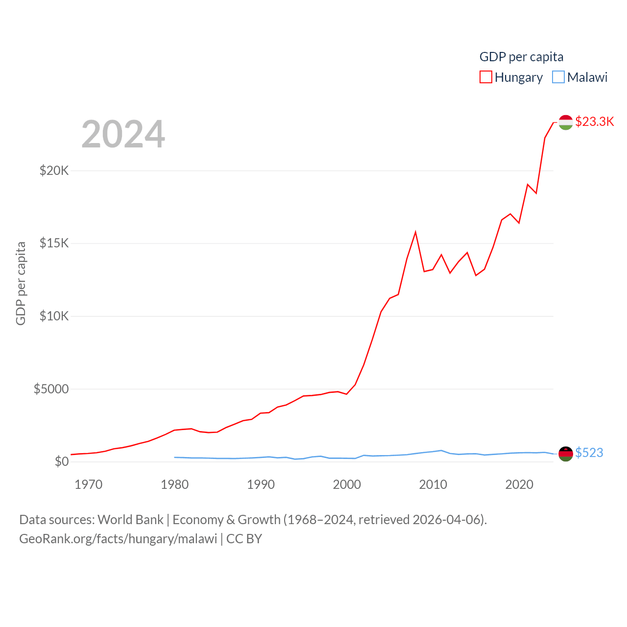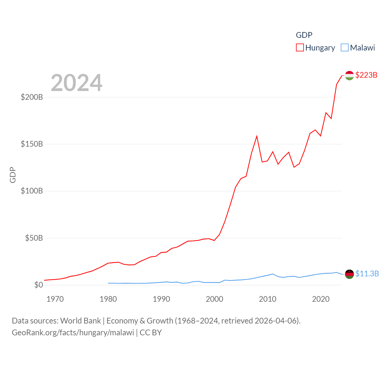 By GDP, Hungary ranks 55/197 ($223B) and Malawi ranks 151/197 ($11.3B). By GDP per capita, Hungary ranks 55/197 ($23,292), while Malawi ranks 194/197 ($523).