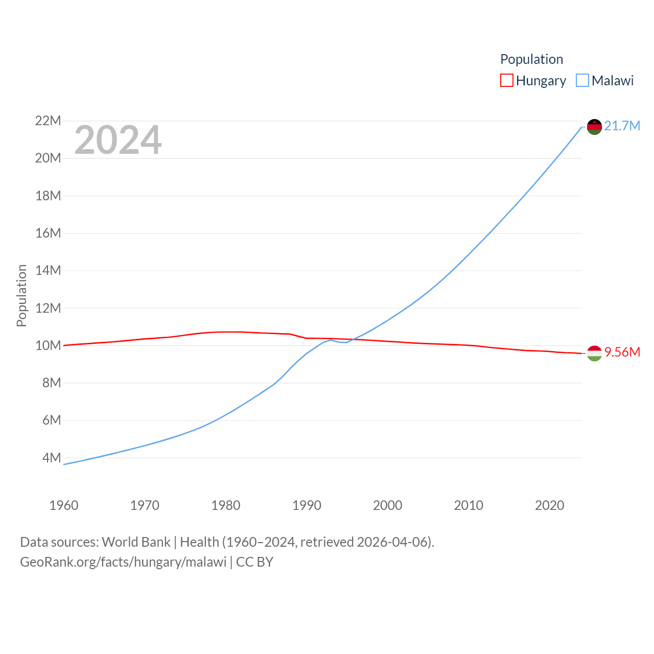 Hungary has a population of 9.56M (ranked 97/197), compared with 21.7M in Malawi (ranked 62/197). Hungary's land area is 35,236 sq mi versus 36,402 sq mi for Malawi (ranked 109th vs. 107th).