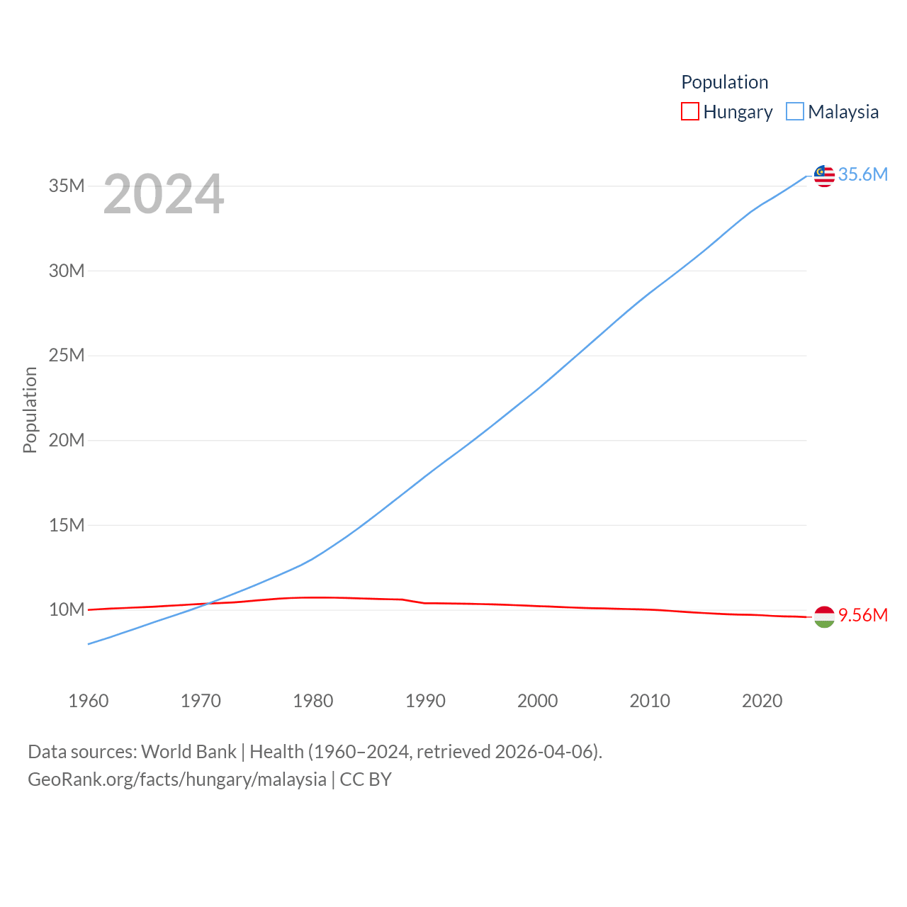 Hungary has a population of 9.56M (ranked 97/197), compared with 35.6M in Malaysia (ranked 44/197). Hungary's land area is 35,236 sq mi versus 126,854 sq mi for Malaysia (ranked 109th vs. 65th).