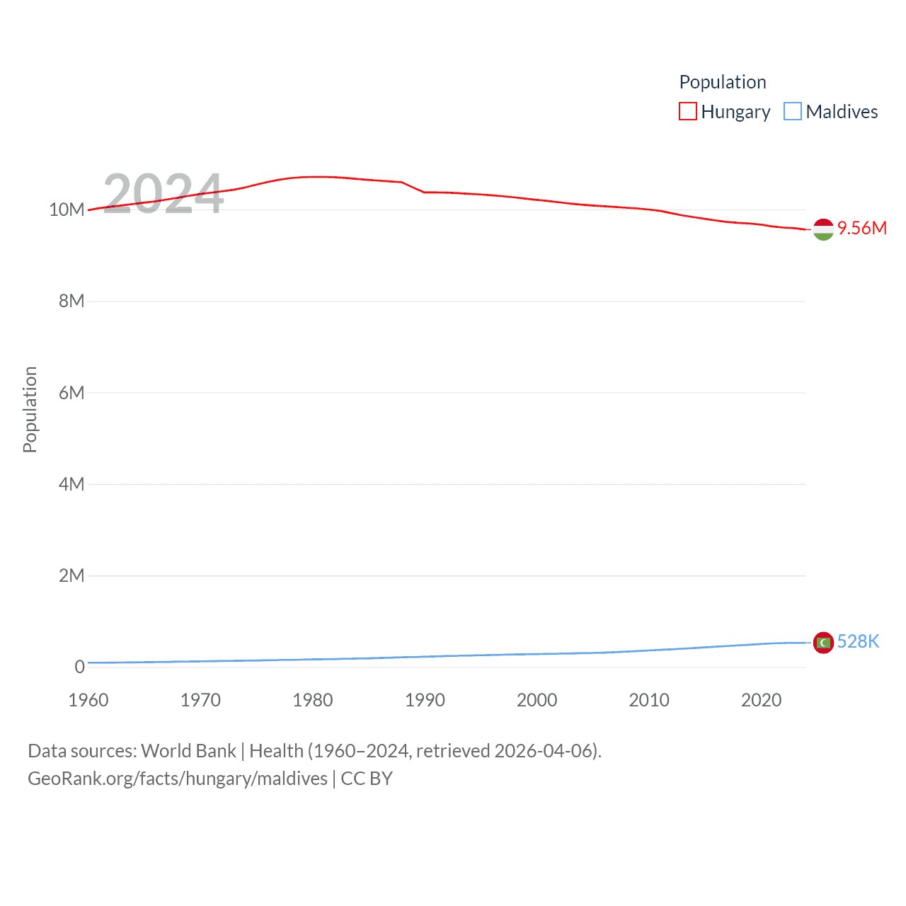 Hungary has a population of 9.56M (ranked 97/197), compared with 528K in Maldives (ranked 168/197). Hungary's land area is 35,236 sq mi versus 115.1 sq mi for Maldives (ranked 109th vs. 188th).