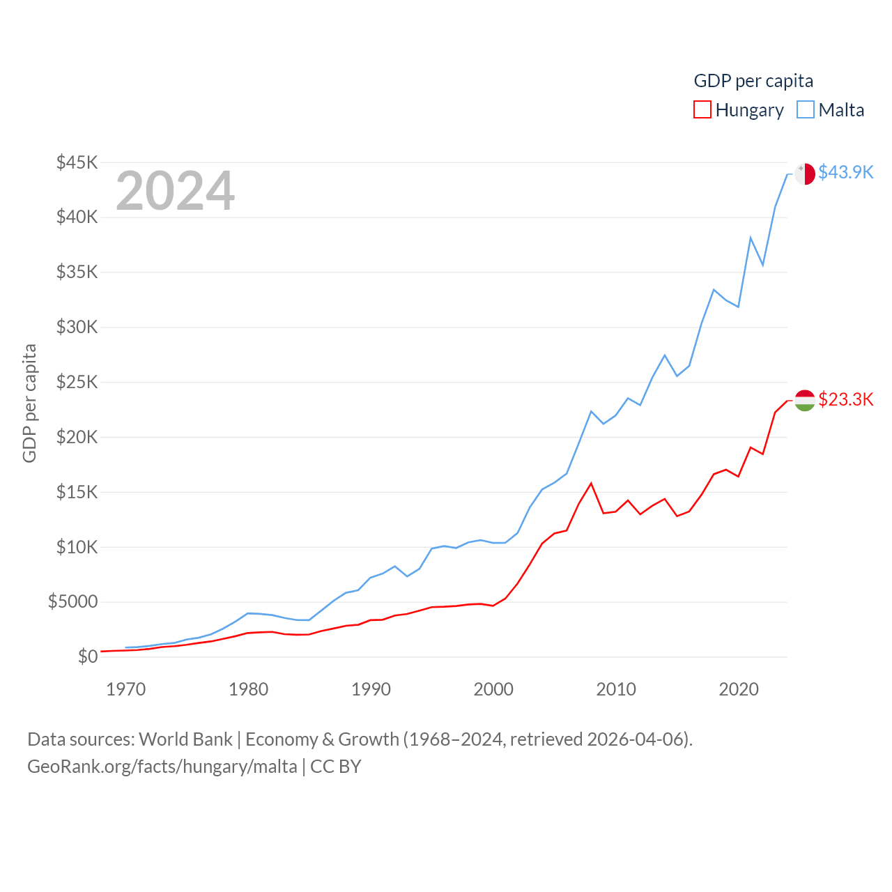 By GDP, Hungary ranks 55/197 ($223B) and Malta ranks 119/197 ($25B). By GDP per capita, Hungary ranks 55/197 ($23,292), while Malta ranks 28/197 ($43,899).