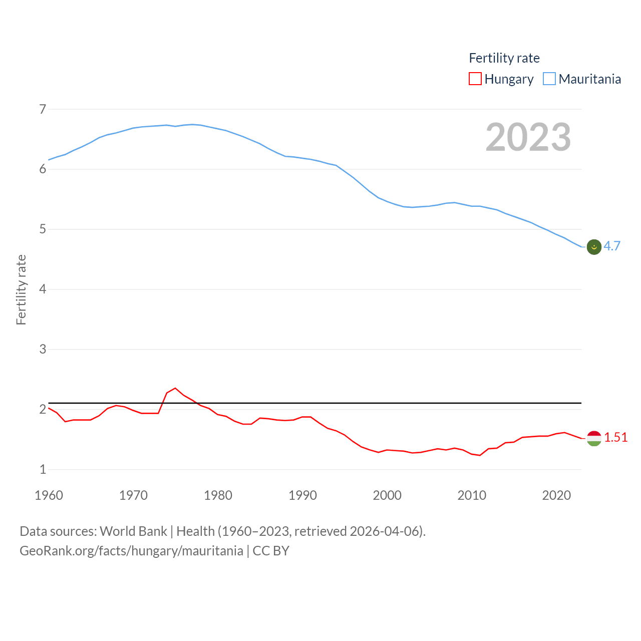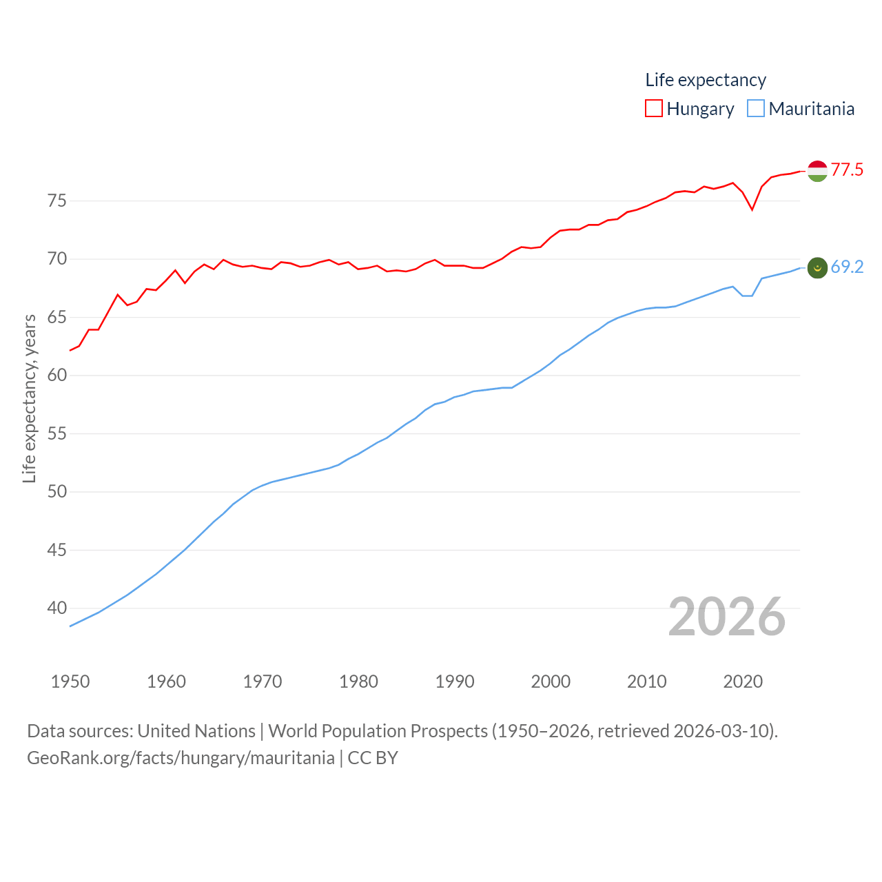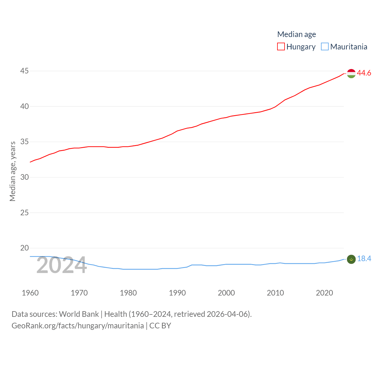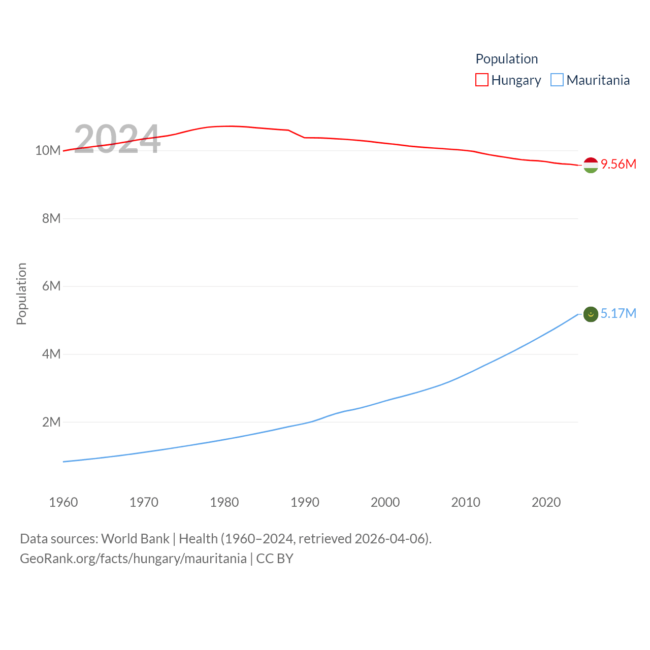 Hungary has a population of 9.56M (ranked 97/197), compared with 5.17M in Mauritania (ranked 125/197). Hungary's land area is 35,236 sq mi versus 397,955 sq mi for Mauritania (ranked 109th vs. 28th).