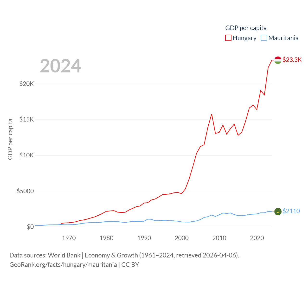 By GDP, Hungary ranks 55/197 ($223B) and Mauritania ranks 153/197 ($10.9B). By GDP per capita, Hungary ranks 55/197 ($23,292), while Mauritania ranks 156/197 ($2,110).