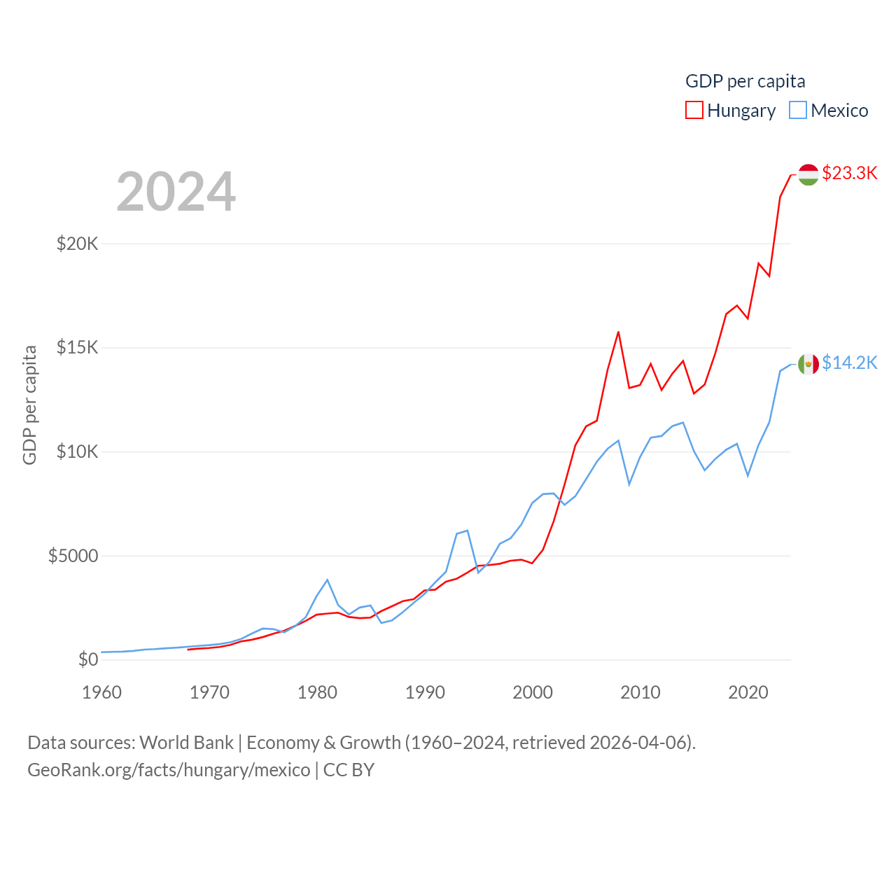 By GDP, Hungary ranks 55/197 ($223B) and Mexico ranks 13/197 ($1.86T). By GDP per capita, Hungary ranks 55/197 ($23,292), while Mexico ranks 69/197 ($14,186).