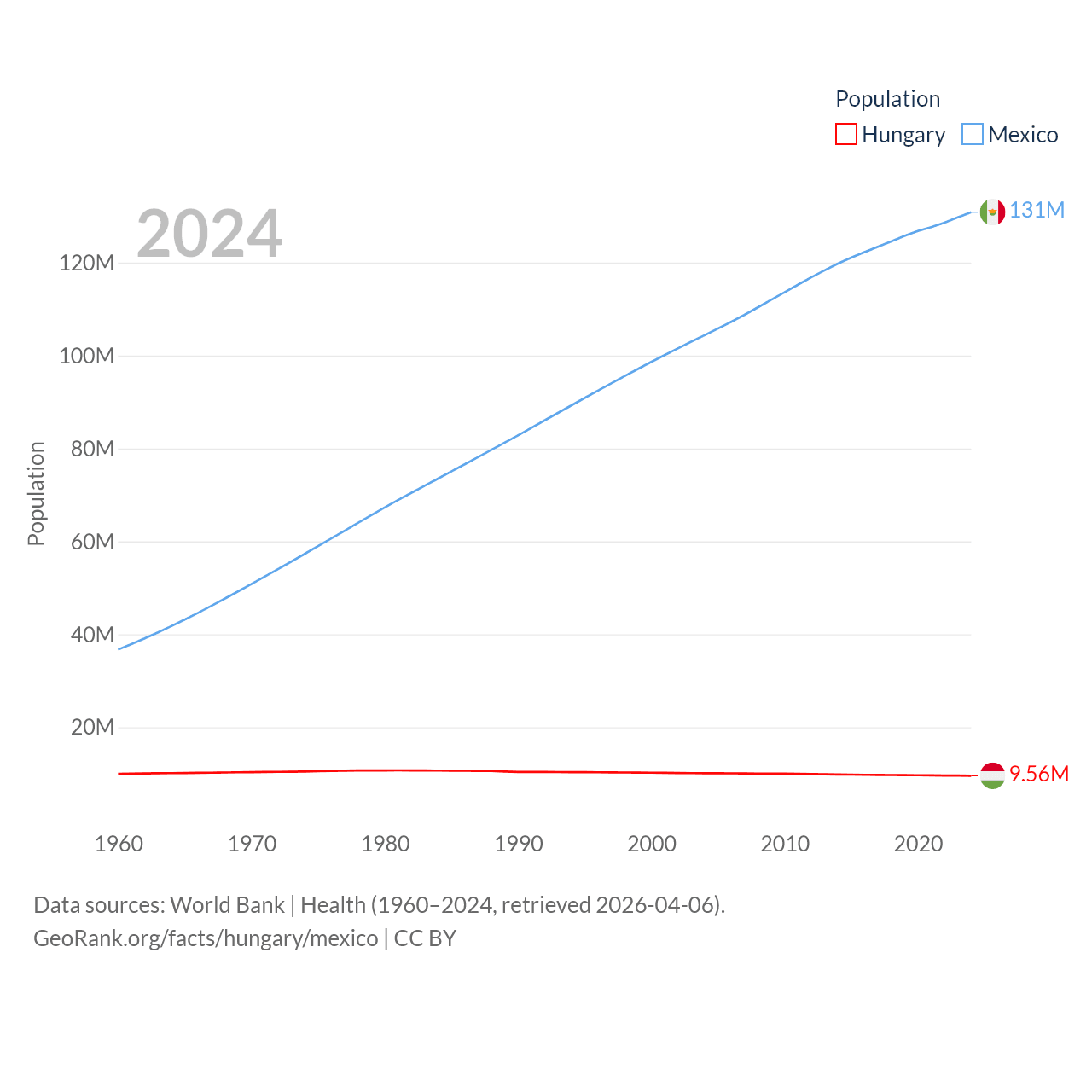 Hungary has a population of 9.56M (ranked 97/197), compared with 131M in Mexico (ranked 11/197). Hungary's land area is 35,236 sq mi versus 750,563 sq mi for Mexico (ranked 109th vs. 13th).