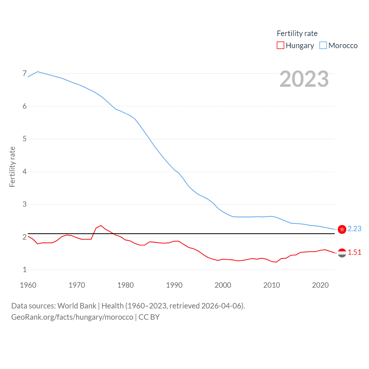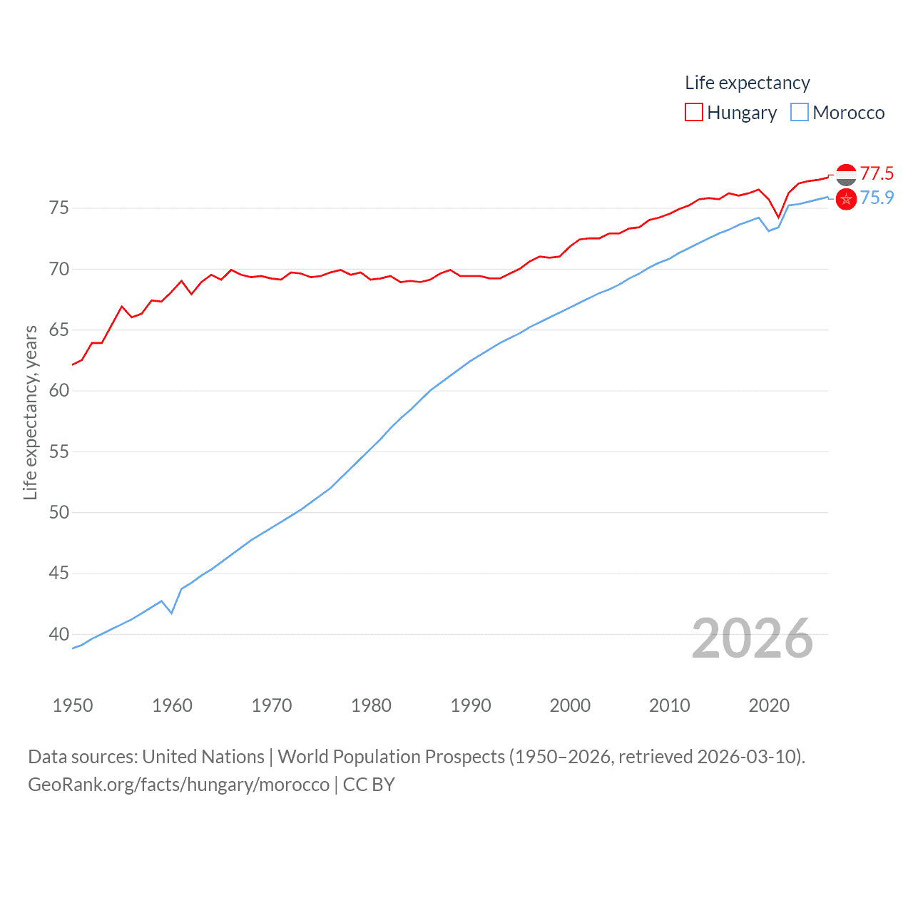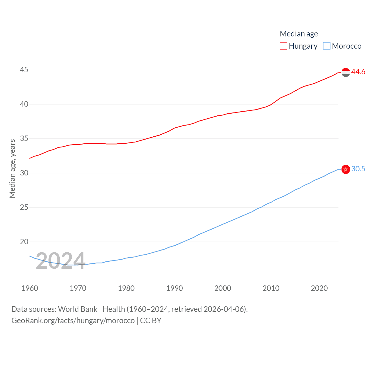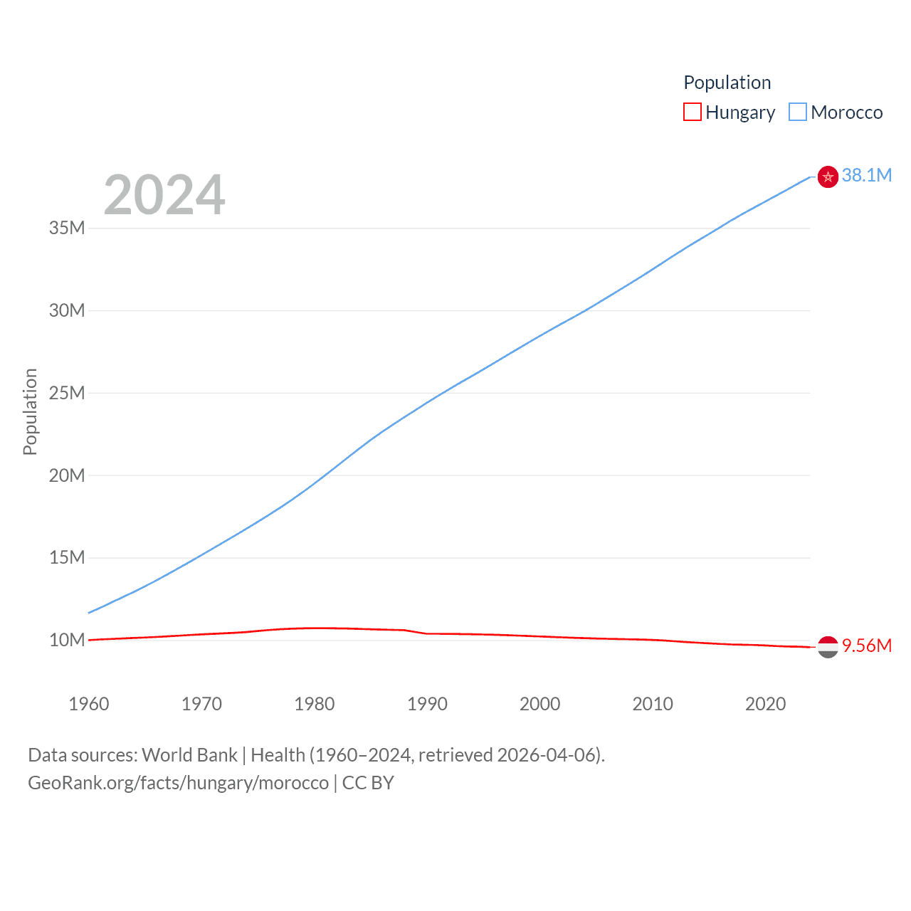 Hungary has a population of 9.56M (ranked 97/197), compared with 38.1M in Morocco (ranked 39/197). Hungary's land area is 35,236 sq mi versus 172,317 sq mi for Morocco (ranked 109th vs. 55th).