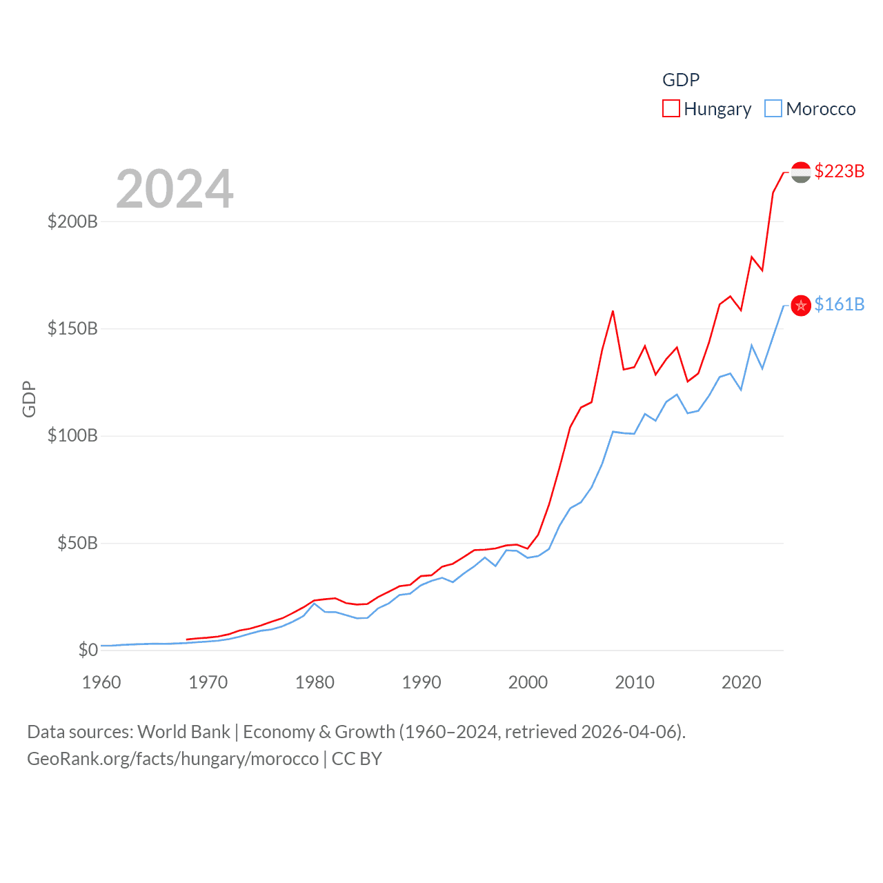 By GDP, Hungary ranks 55/197 ($223B) and Morocco ranks 58/197 ($161B). By GDP per capita, Hungary ranks 55/197 ($23,292), while Morocco ranks 127/197 ($4,218).