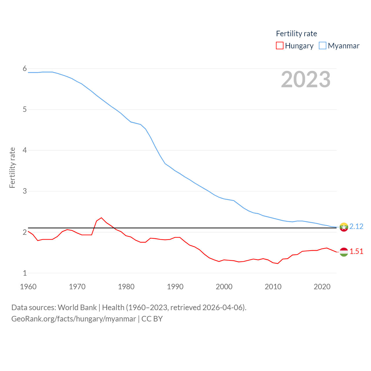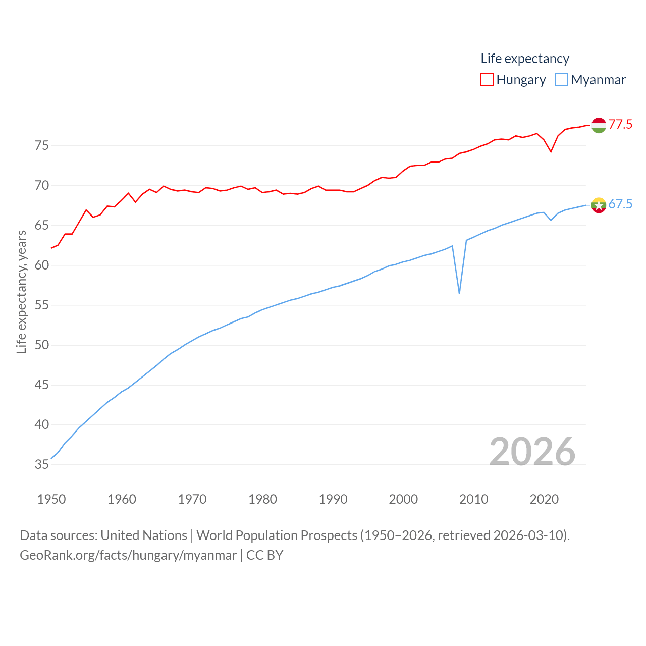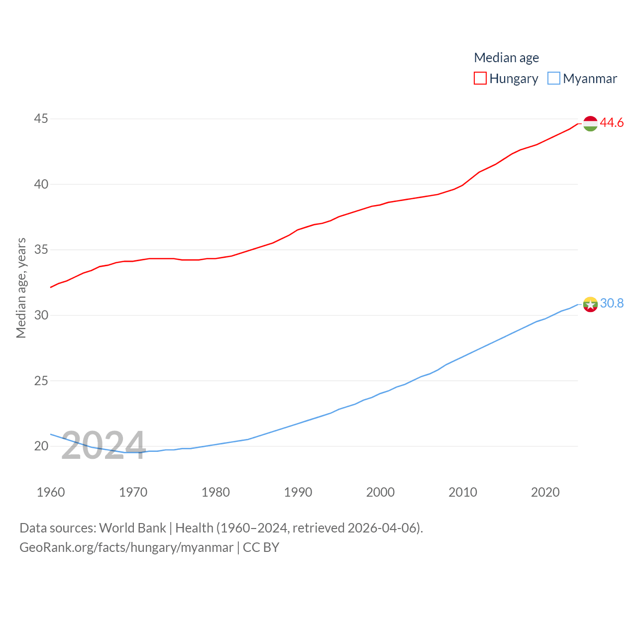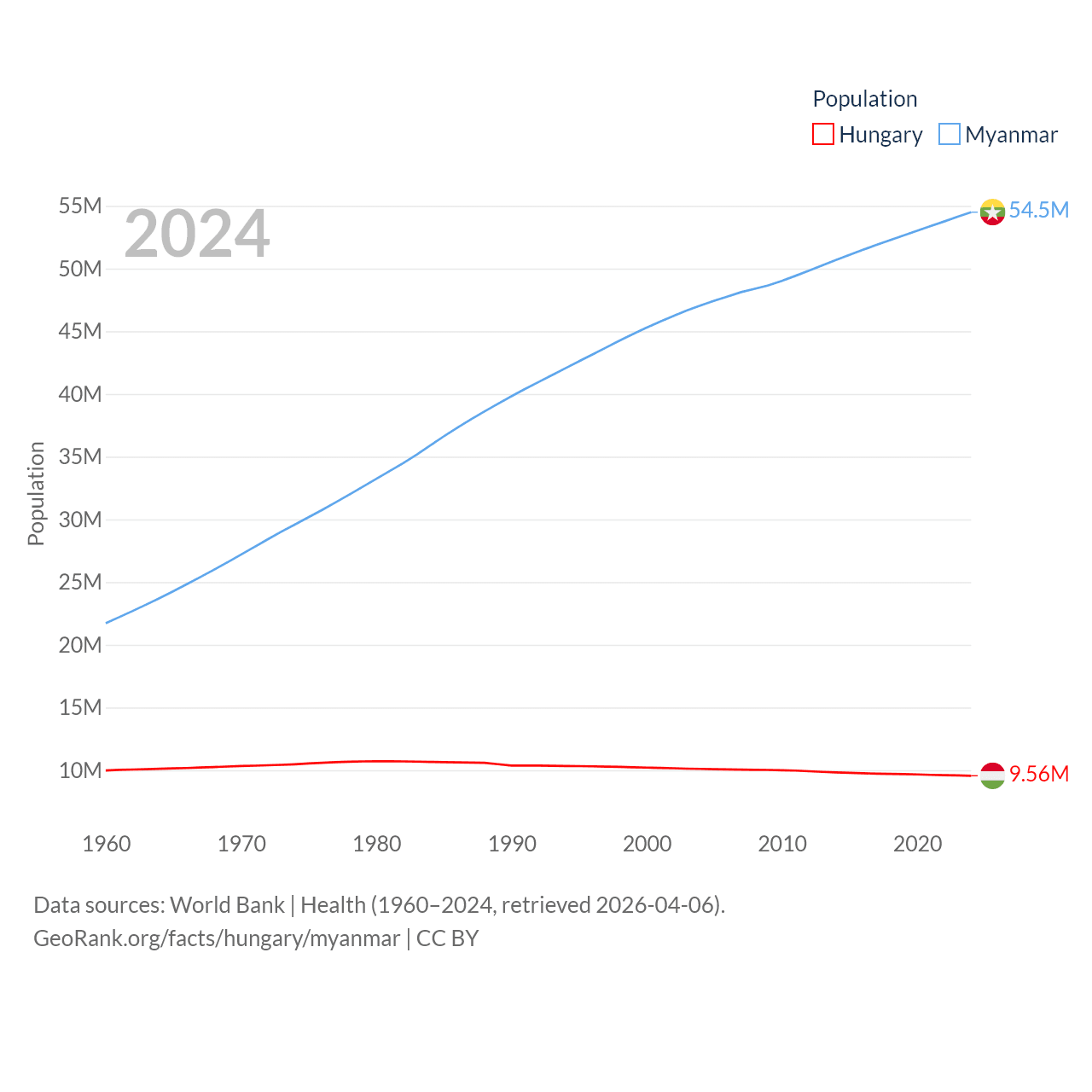 Hungary has a population of 9.56M (ranked 97/197), compared with 54.5M in Myanmar (ranked 27/197). Hungary's land area is 35,236 sq mi versus 251,997 sq mi for Myanmar (ranked 109th vs. 39th).