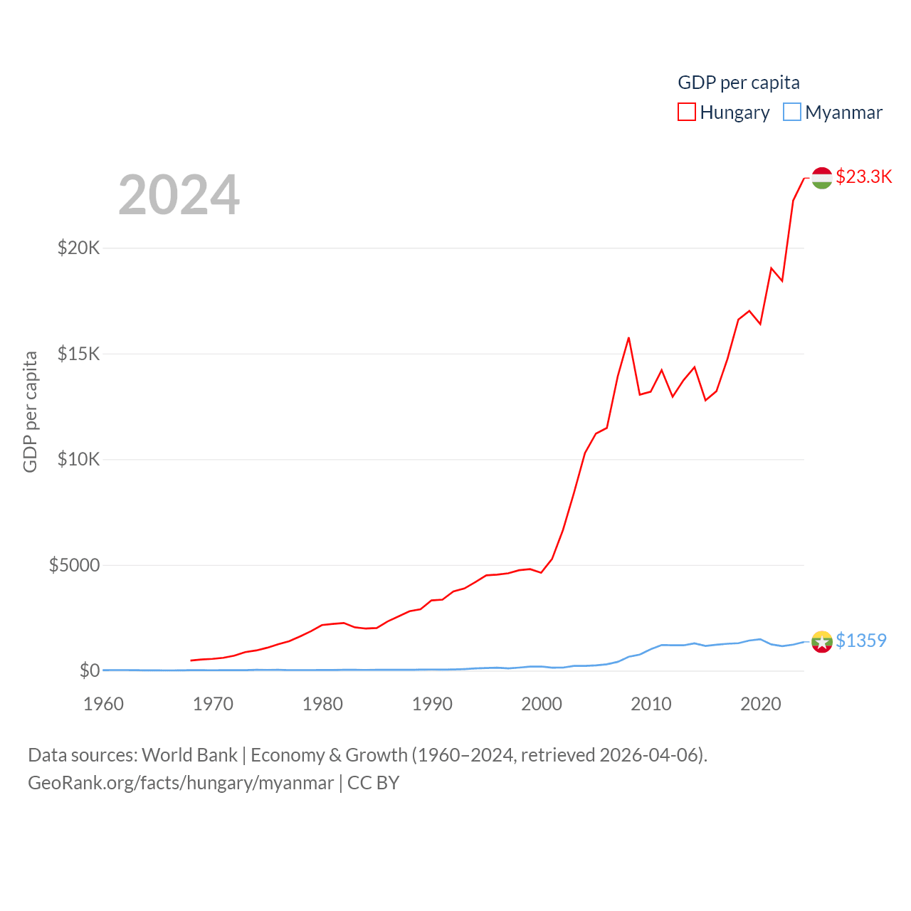 By GDP, Hungary ranks 55/197 ($223B) and Myanmar ranks 85/197 ($74.1B). By GDP per capita, Hungary ranks 55/197 ($23,292), while Myanmar ranks 165/197 ($1,359).