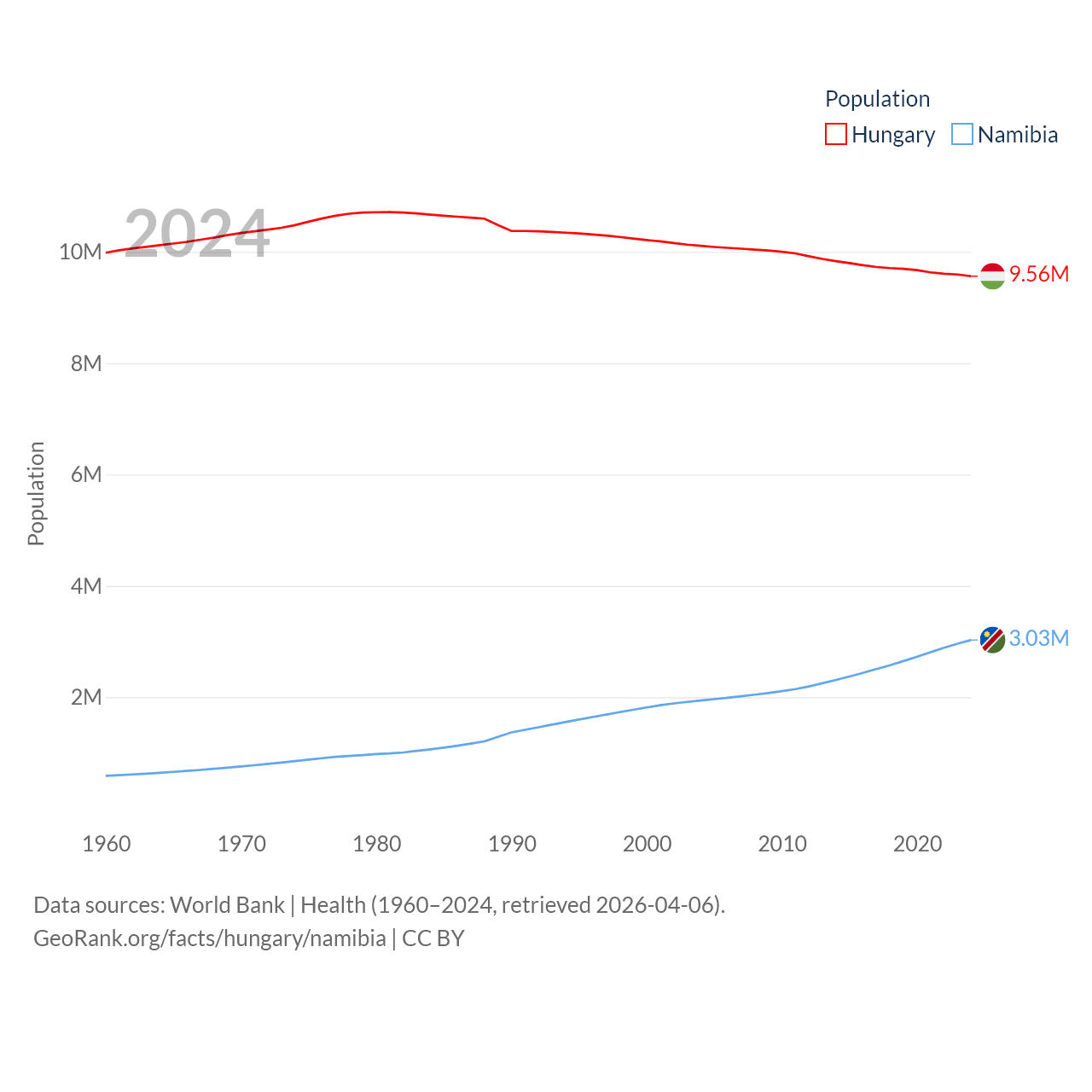 Hungary has a population of 9.56M (ranked 97/197), compared with 3.03M in Namibia (ranked 136/197). Hungary's land area is 35,236 sq mi versus 317,874 sq mi for Namibia (ranked 109th vs. 33rd).
