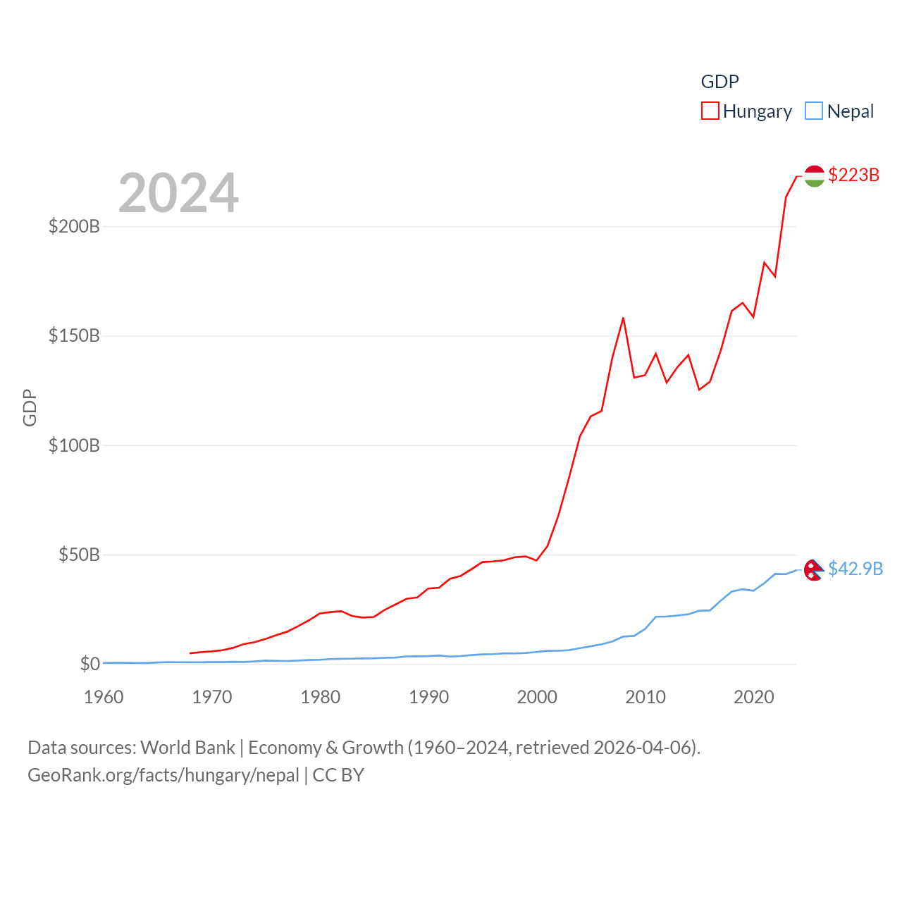 By GDP, Hungary ranks 55/197 ($223B) and Nepal ranks 101/197 ($42.9B). By GDP per capita, Hungary ranks 55/197 ($23,292), while Nepal ranks 164/197 ($1,447).