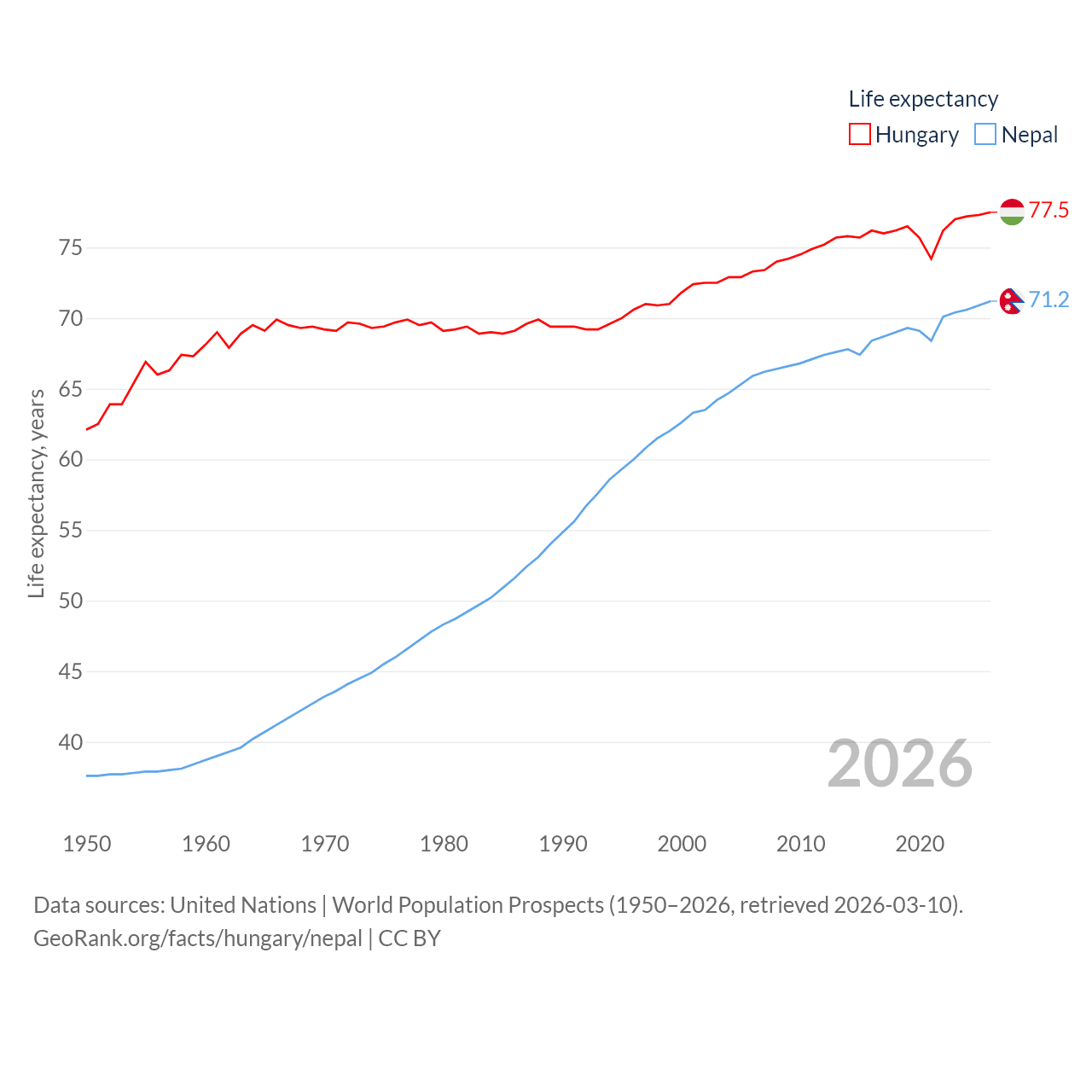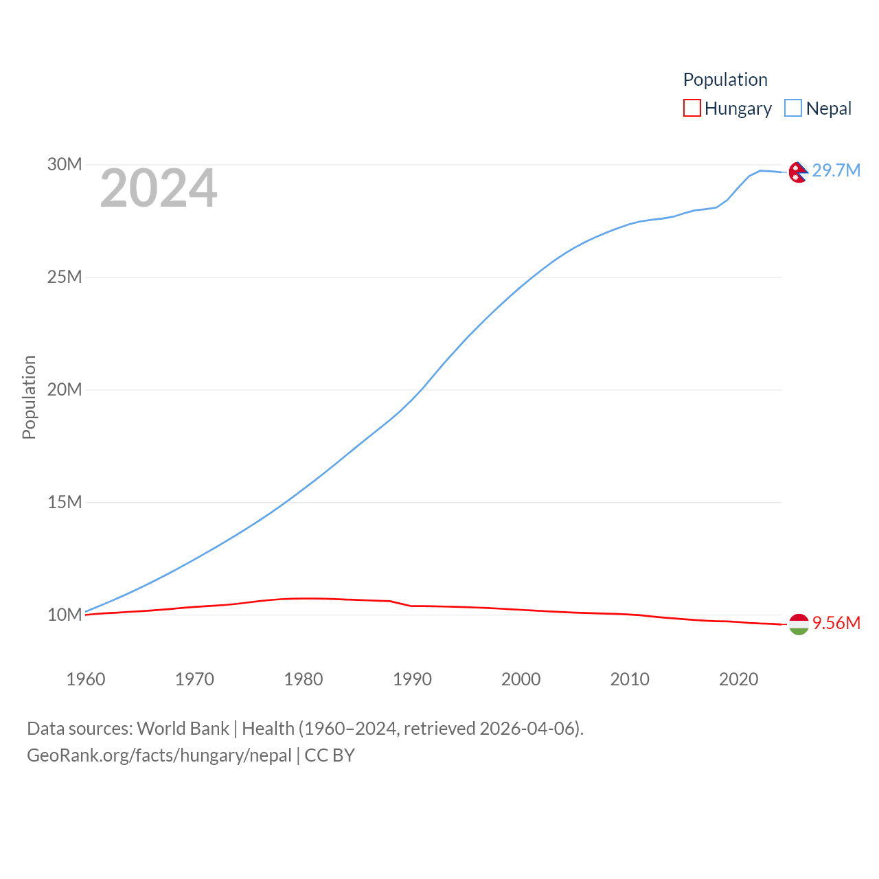 Hungary has a population of 9.56M (ranked 97/197), compared with 29.7M in Nepal (ranked 51/197). Hungary's land area is 35,236 sq mi versus 55,348 sq mi for Nepal (ranked 109th vs. 92nd).