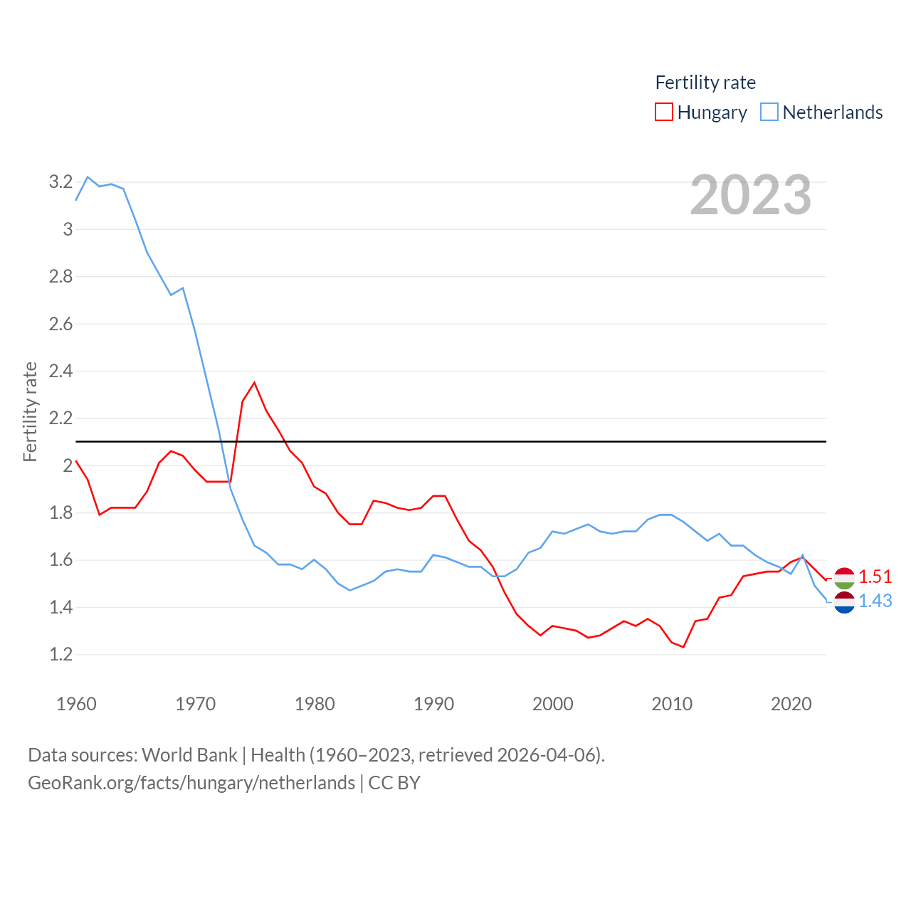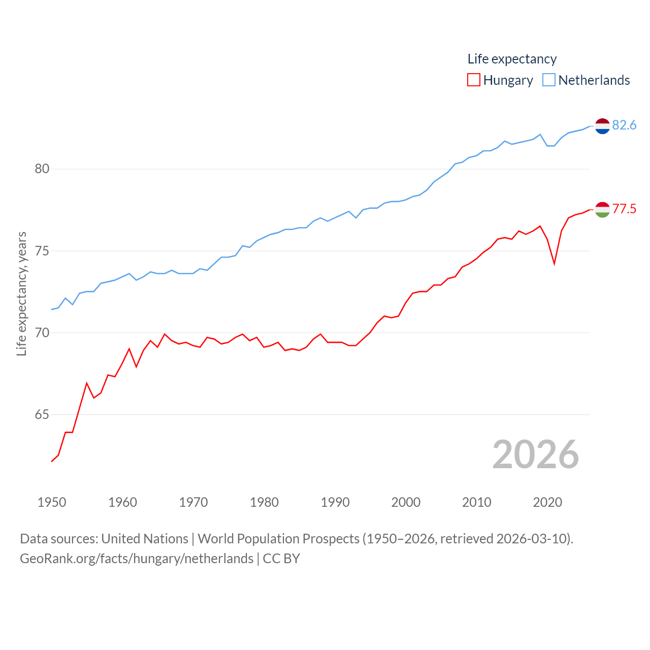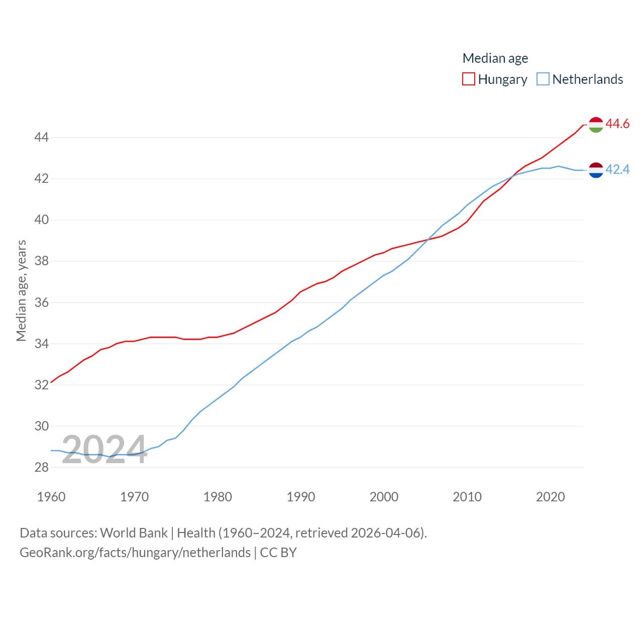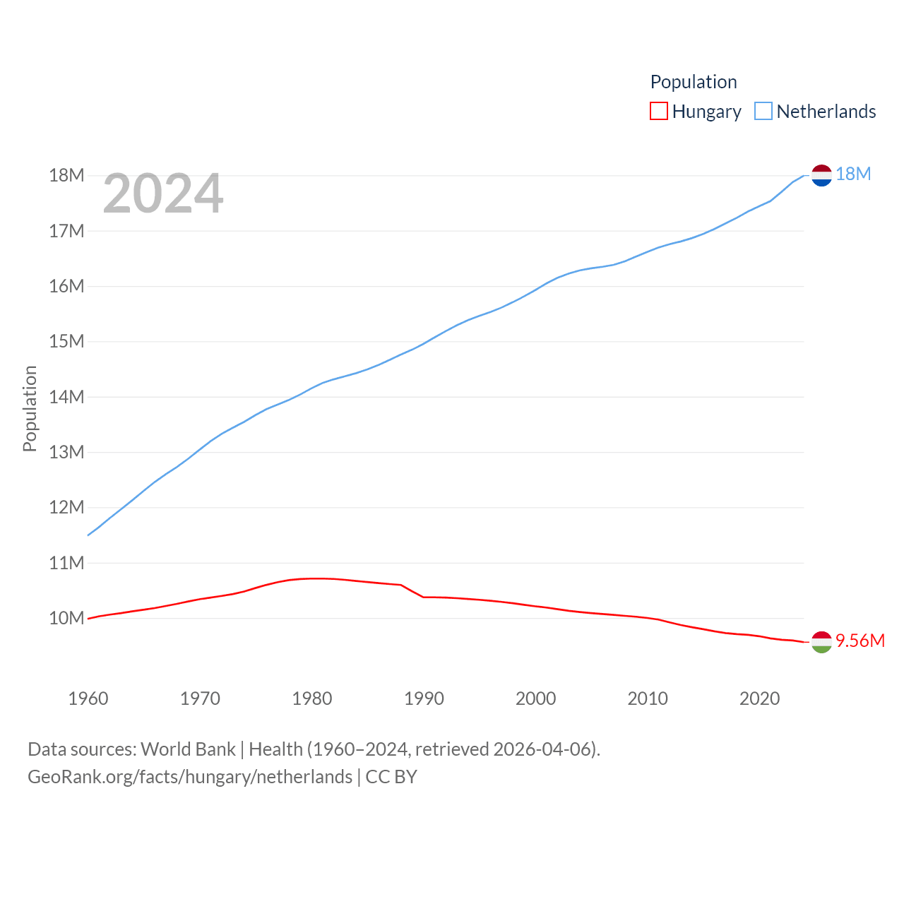 Hungary has a population of 9.56M (ranked 97/197), compared with 18M in The Netherlands (ranked 72/197). Hungary's land area is 35,236 sq mi versus 13,000 sq mi for The Netherlands (ranked 109th vs. 134th).