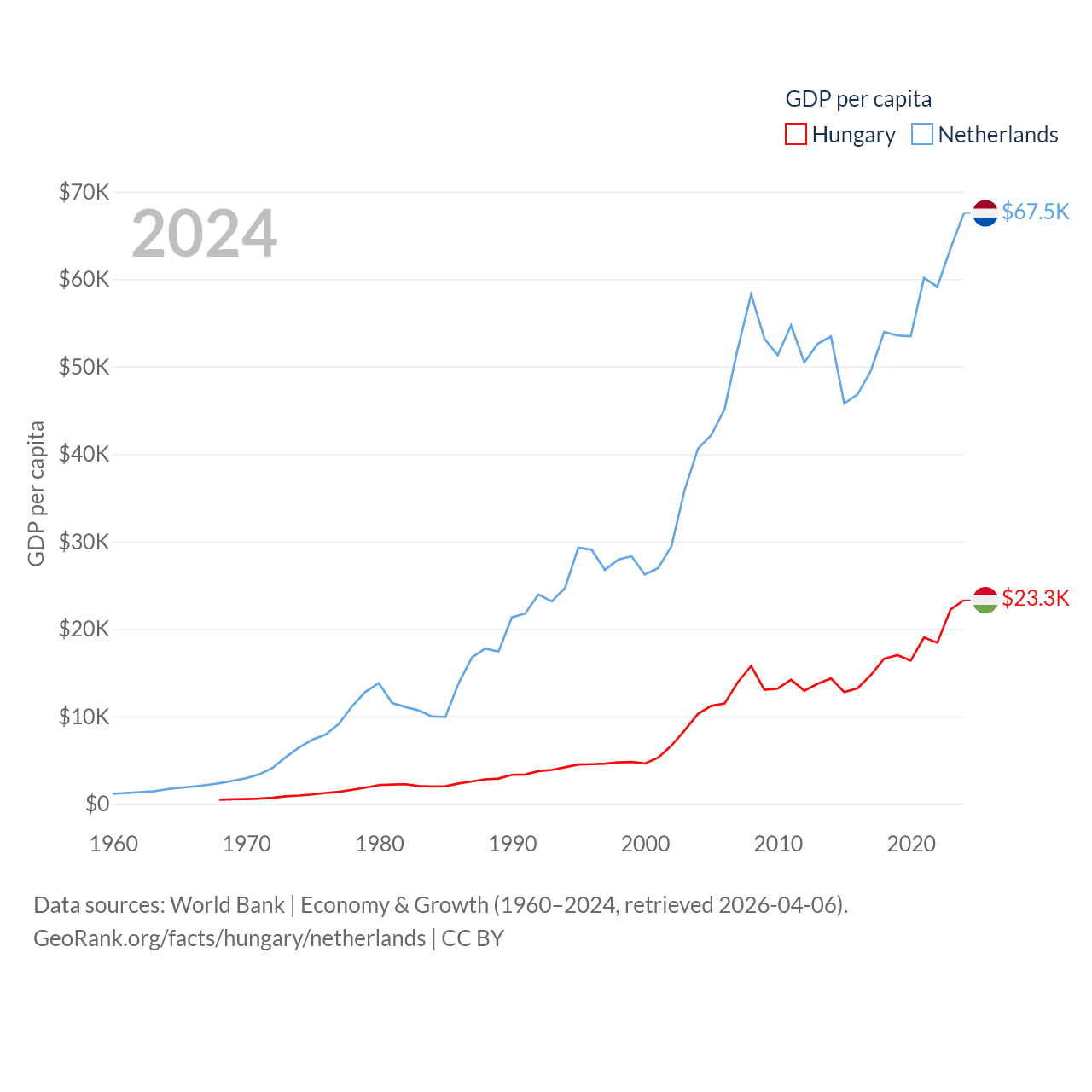 By GDP, Hungary ranks 55/197 ($223B) and The Netherlands ranks 19/197 ($1.21T). By GDP per capita, Hungary ranks 55/197 ($23,292), while The Netherlands ranks 13/197 ($67,520).