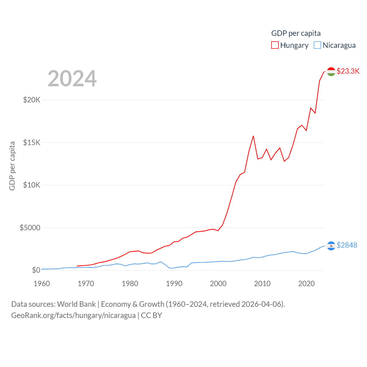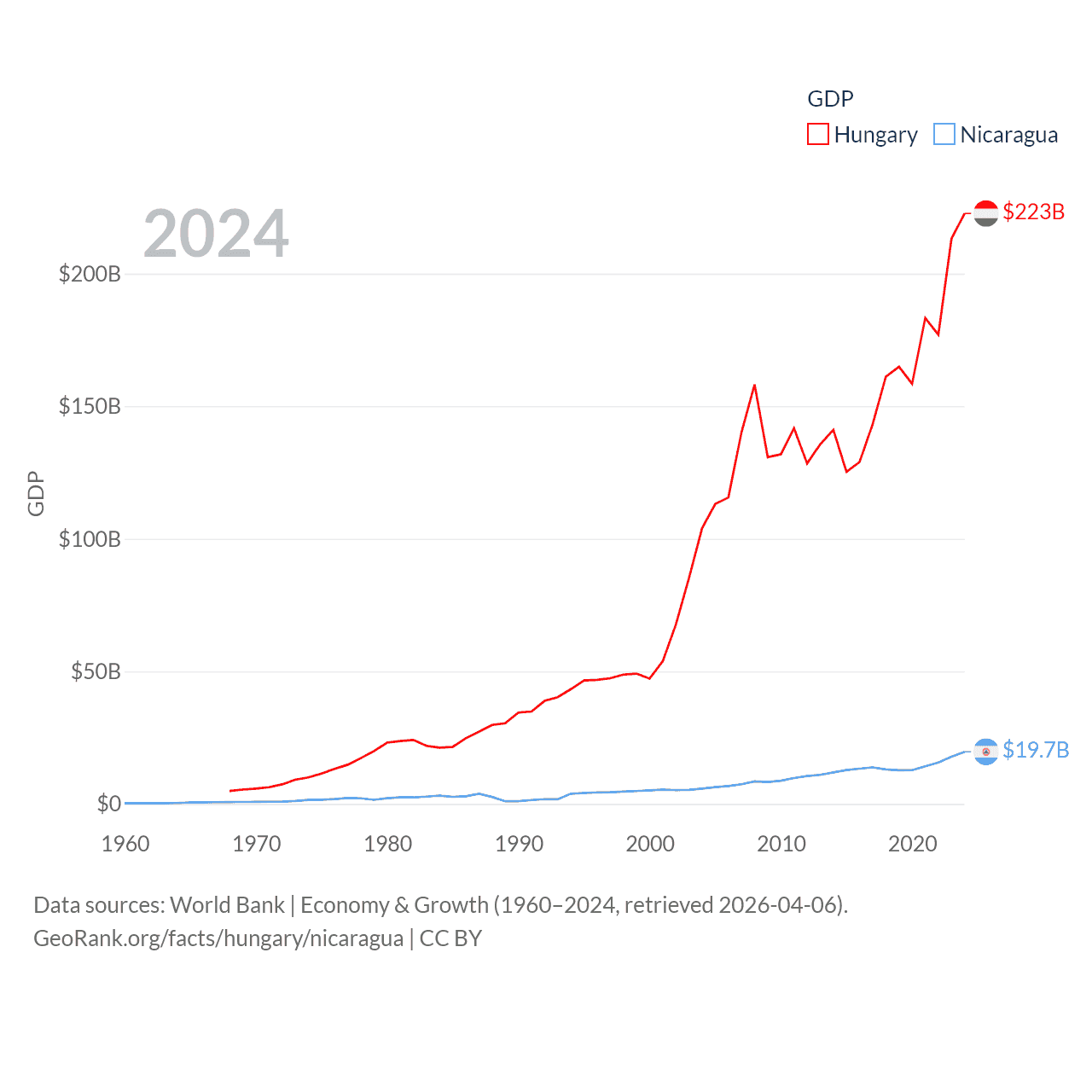 By GDP, Hungary ranks 55/197 ($223B) and Nicaragua ranks 131/197 ($19.7B). By GDP per capita, Hungary ranks 55/197 ($23,292), while Nicaragua ranks 141/197 ($2,848).
