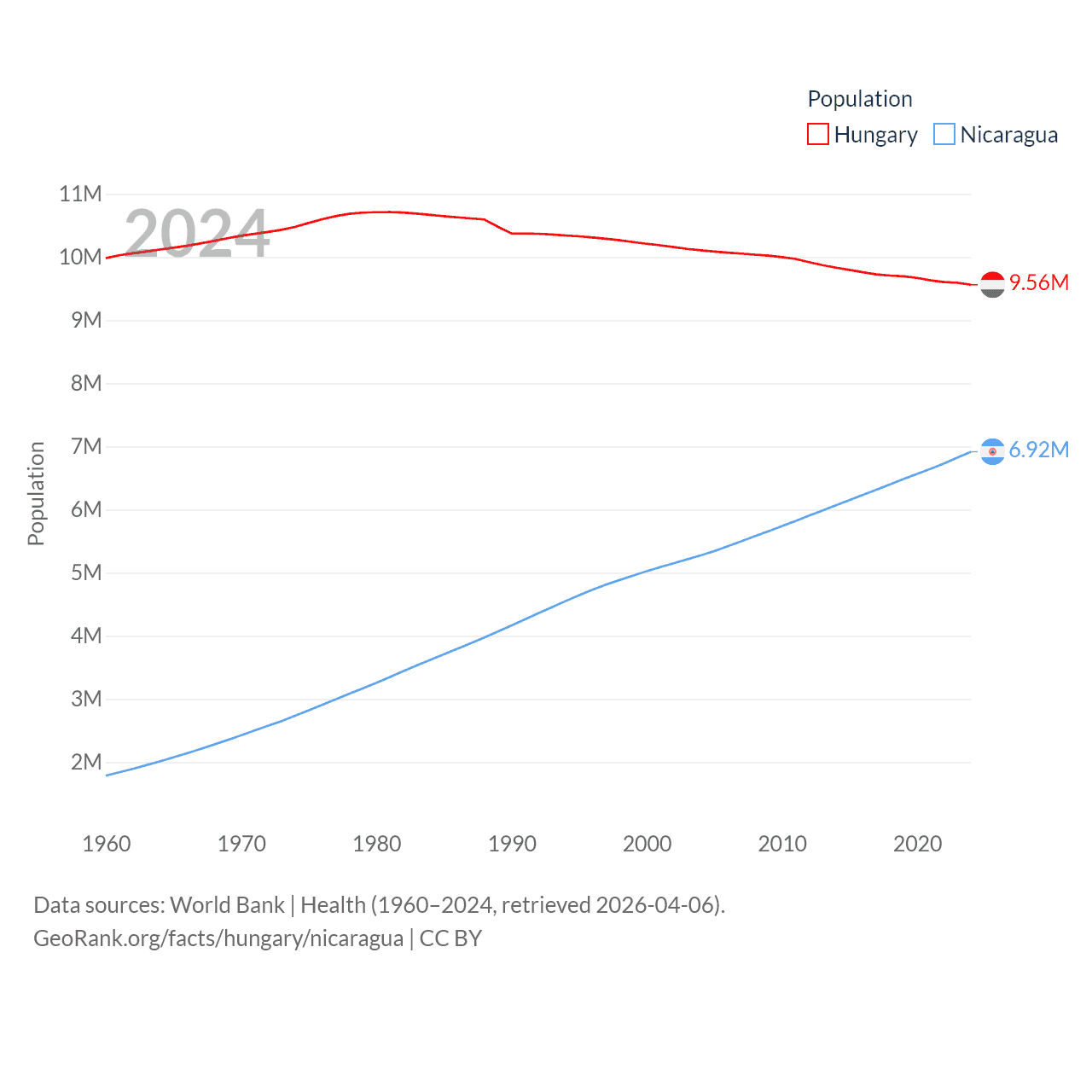 Hungary has a population of 9.56M (ranked 97/197), compared with 6.92M in Nicaragua (ranked 108/197). Hungary's land area is 35,236 sq mi versus 46,464 sq mi for Nicaragua (ranked 109th vs. 98th).