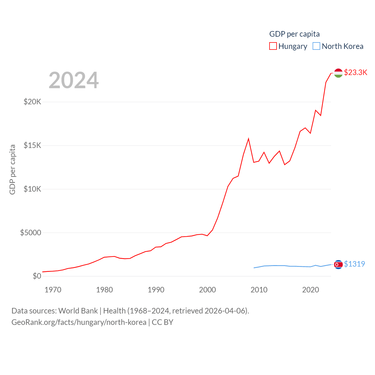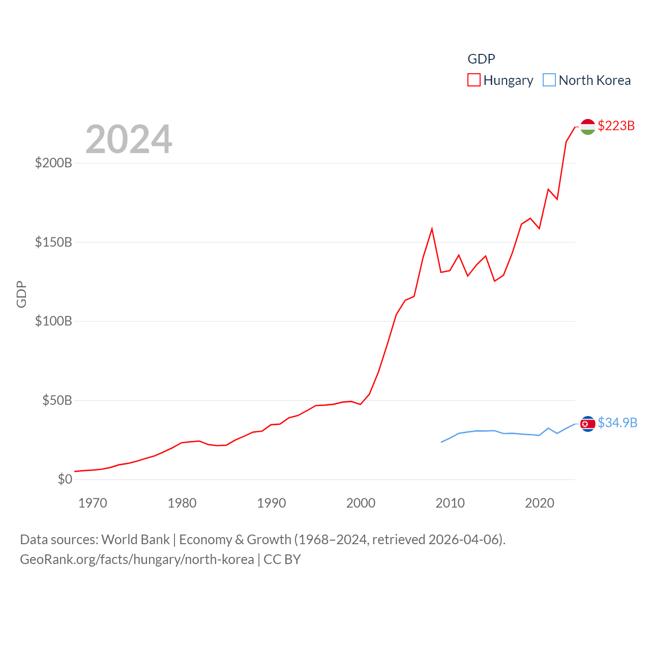 By GDP, Hungary ranks 55/197 ($223B) and North Korea ranks 106/197 ($34.9B). By GDP per capita, Hungary ranks 55/197 ($23,292), while North Korea ranks 168/197 ($1,319).