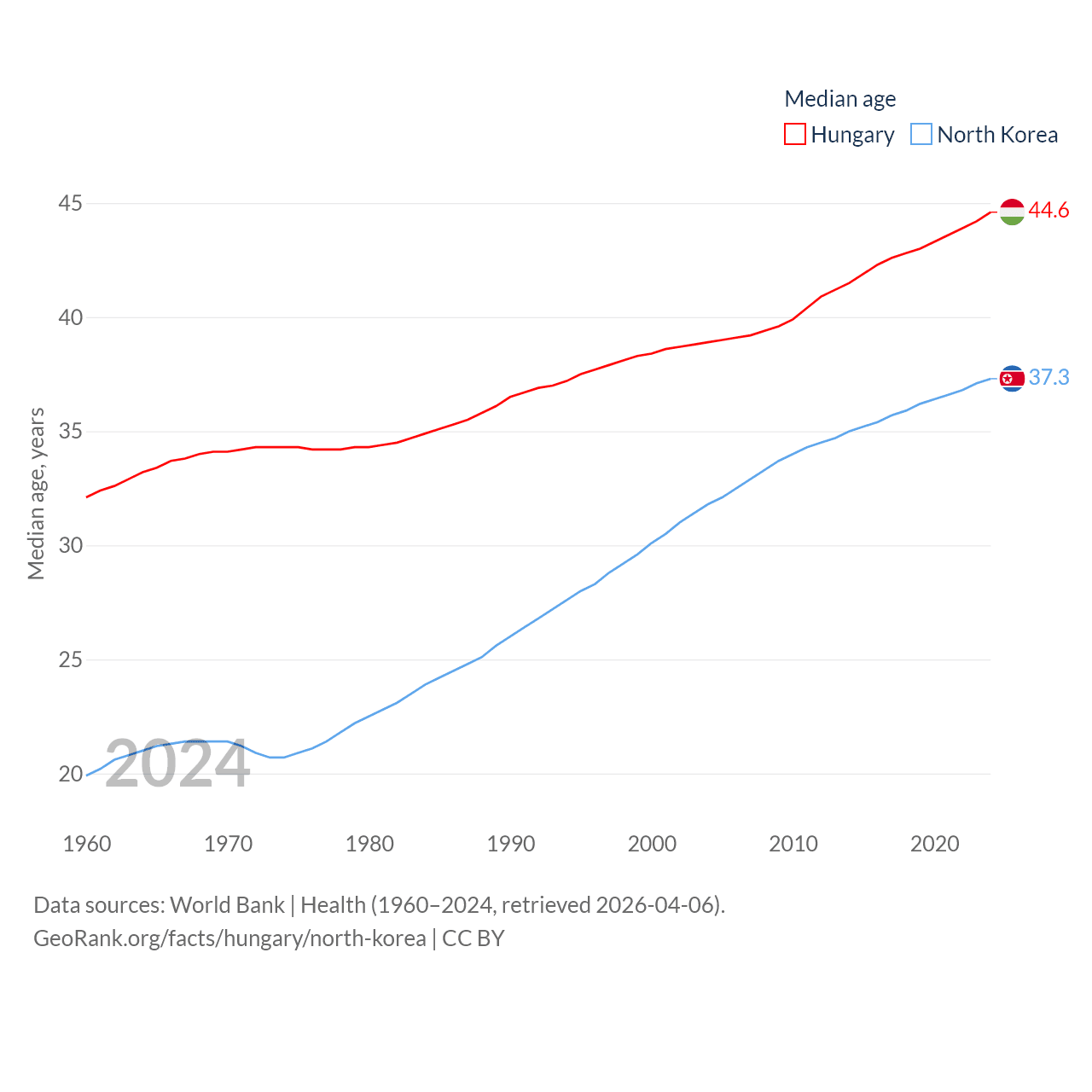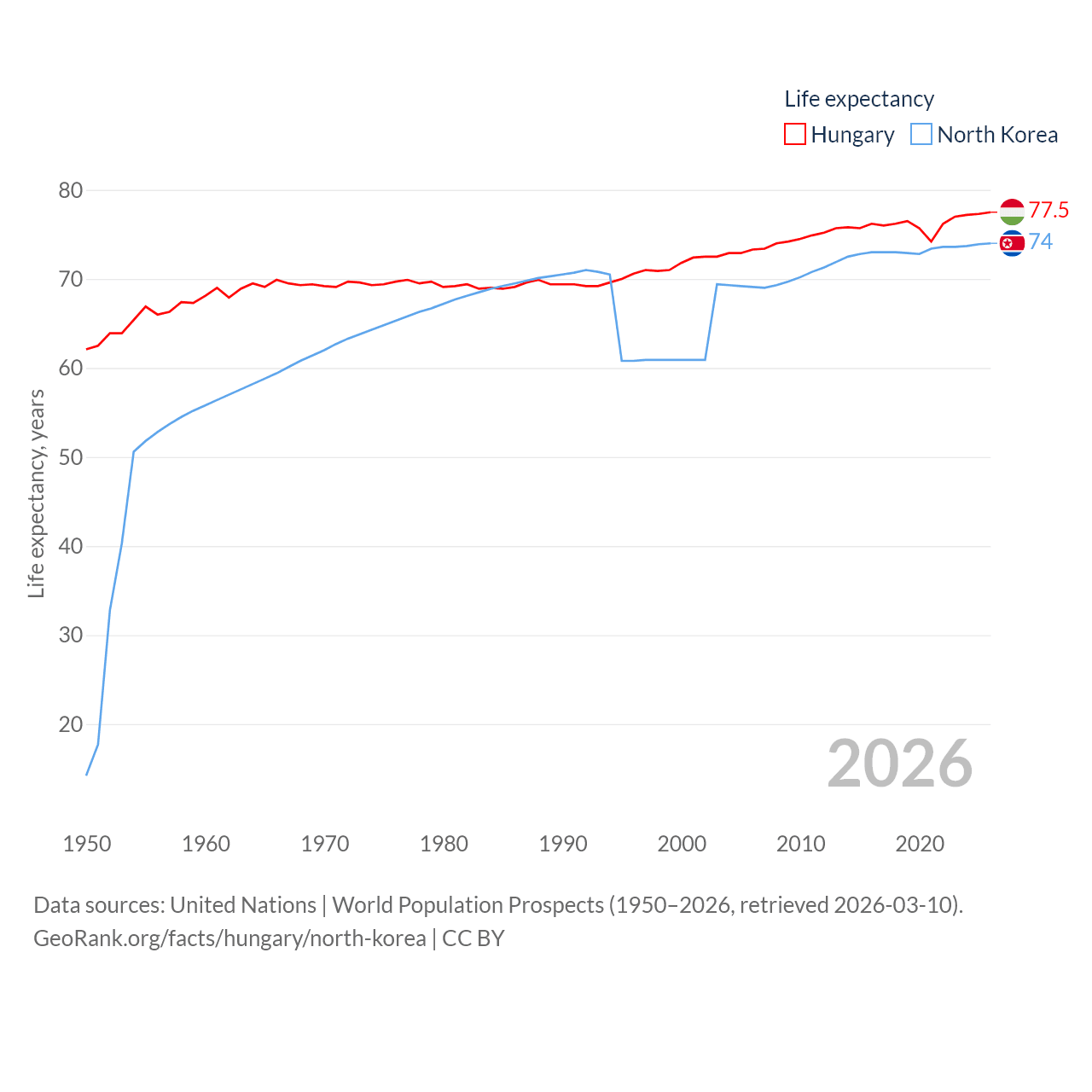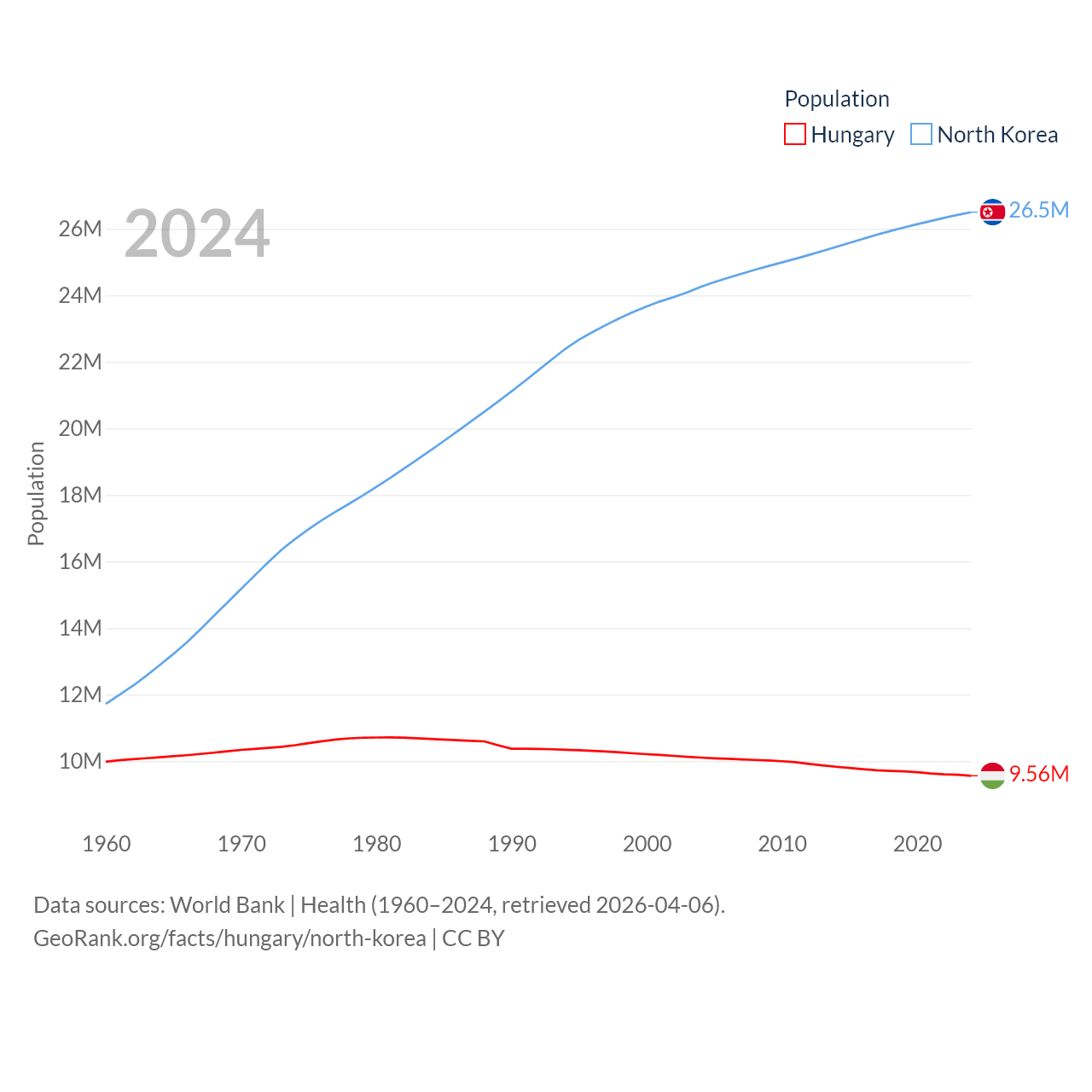 Hungary has a population of 9.56M (ranked 97/197), compared with 26.5M in North Korea (ranked 56/197). Hungary's land area is 35,236 sq mi versus 46,491 sq mi for North Korea (ranked 109th vs. 97th).