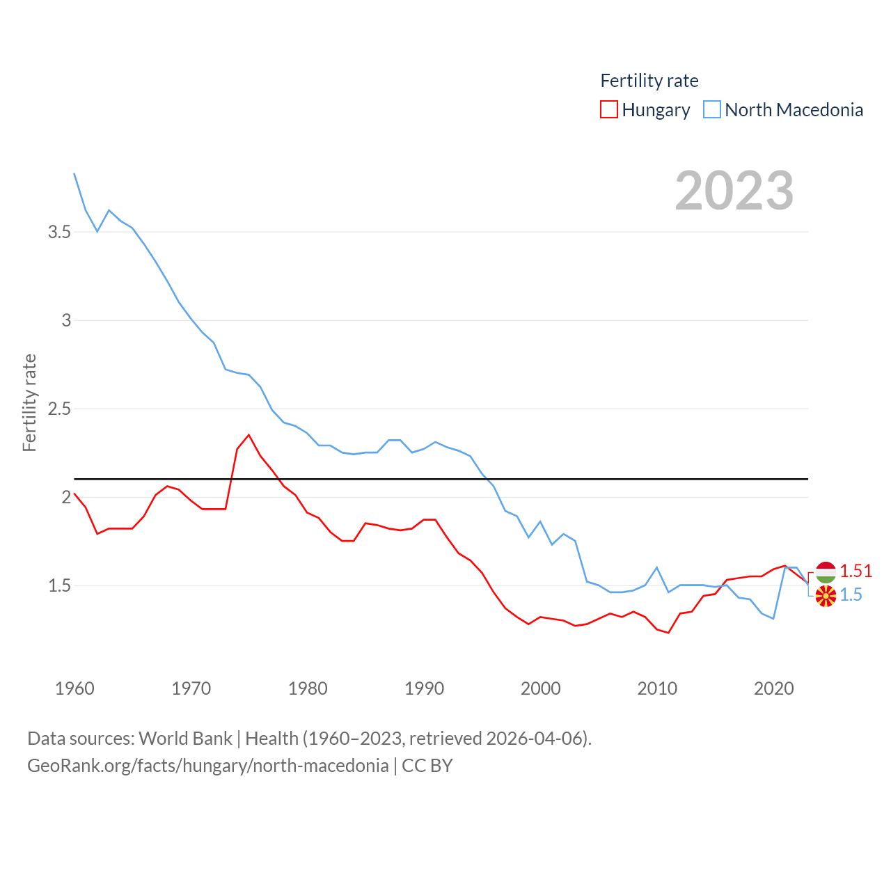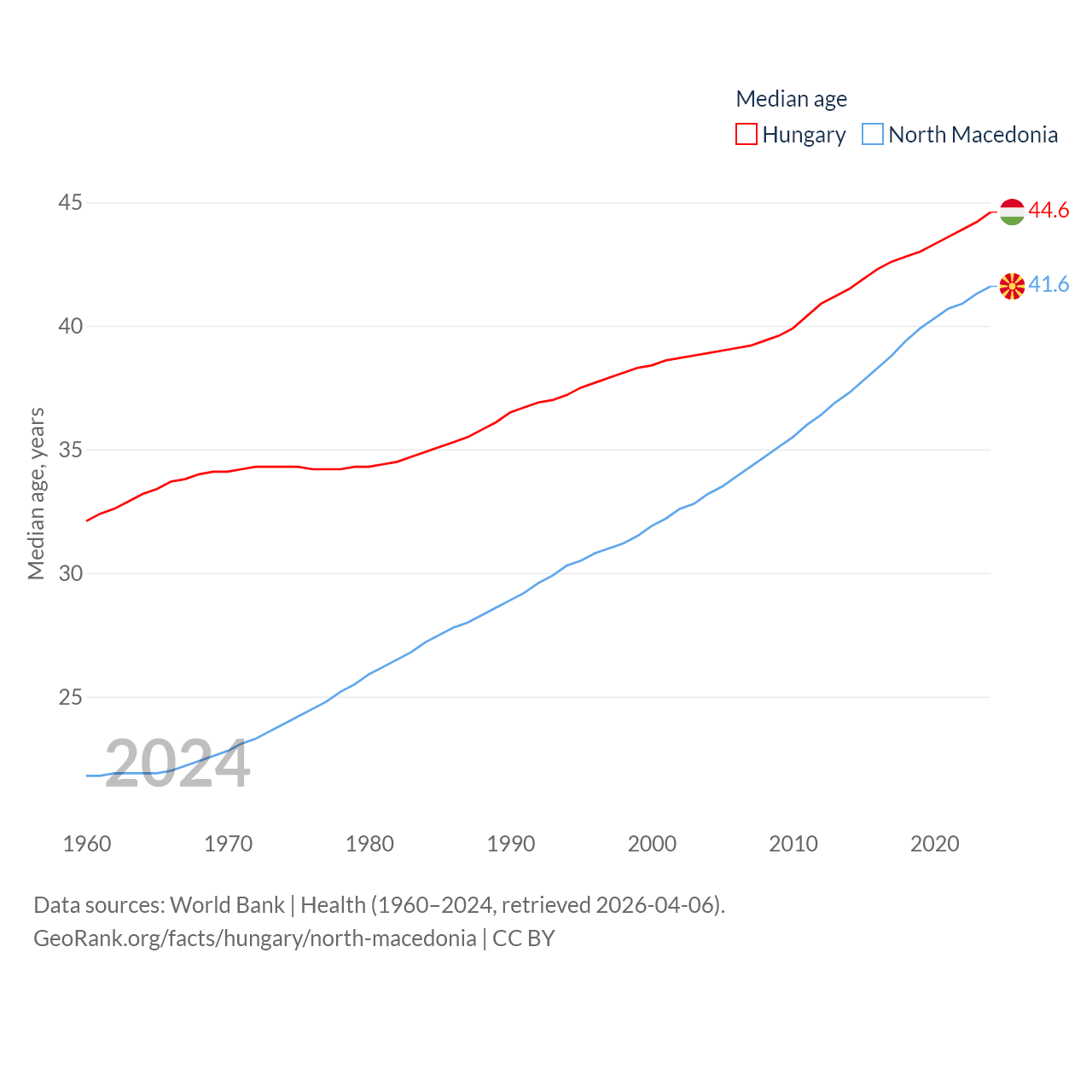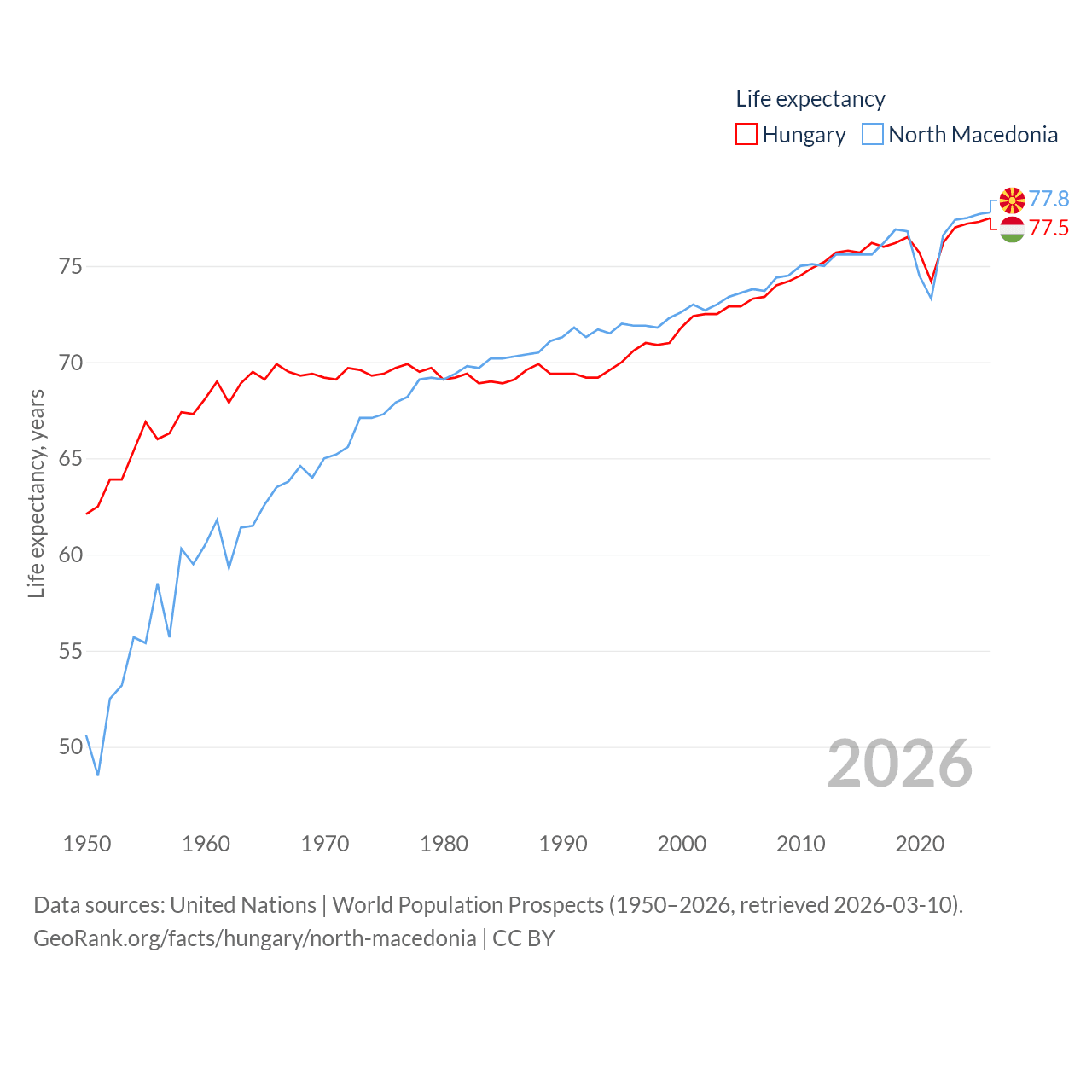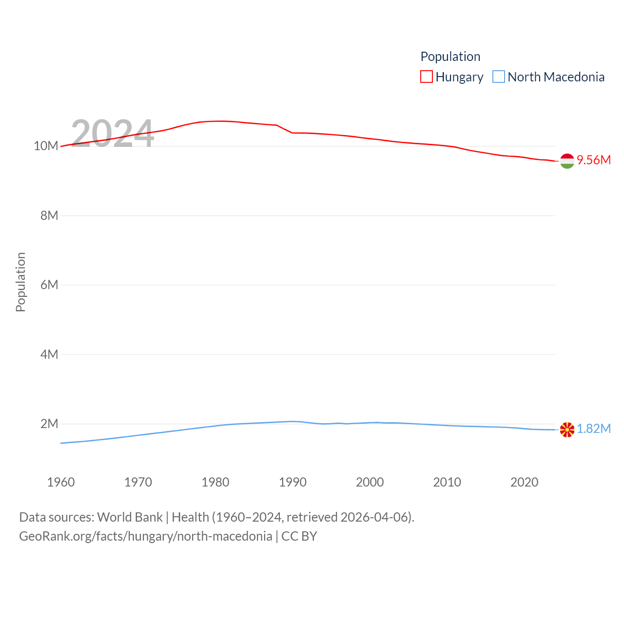 Hungary has a population of 9.56M (ranked 97/197), compared with 1.82M in North Macedonia (ranked 150/197). Hungary's land area is 35,236 sq mi versus 9,737 sq mi for North Macedonia (ranked 109th vs. 145th).
