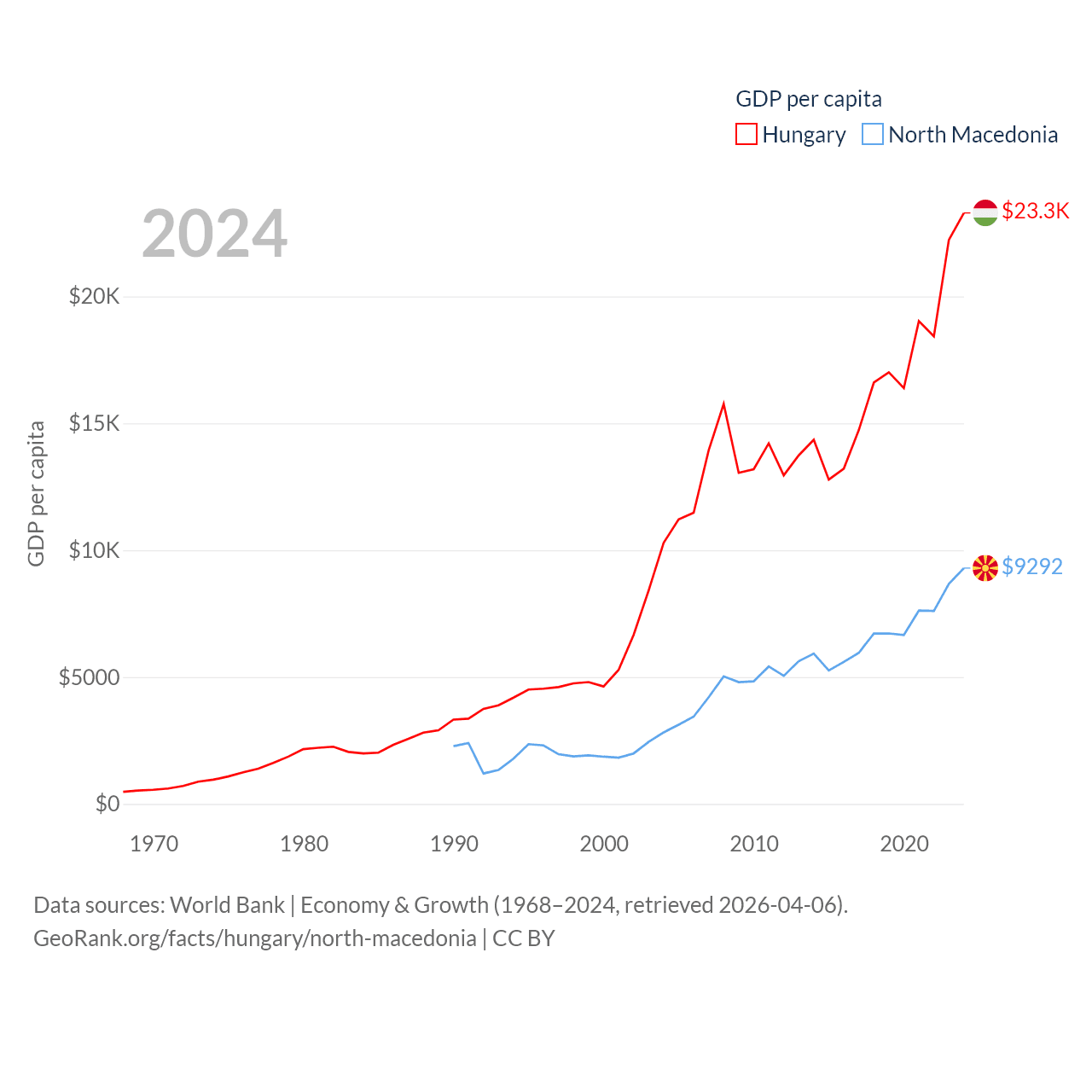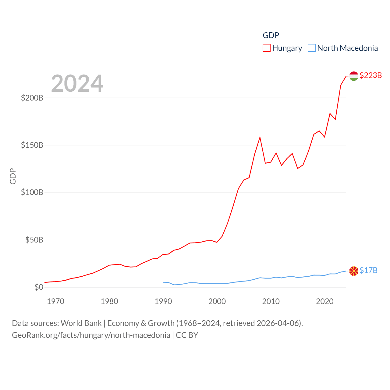 By GDP, Hungary ranks 55/197 ($223B) and North Macedonia ranks 138/197 ($17B). By GDP per capita, Hungary ranks 55/197 ($23,292), while North Macedonia ranks 88/197 ($9,292).