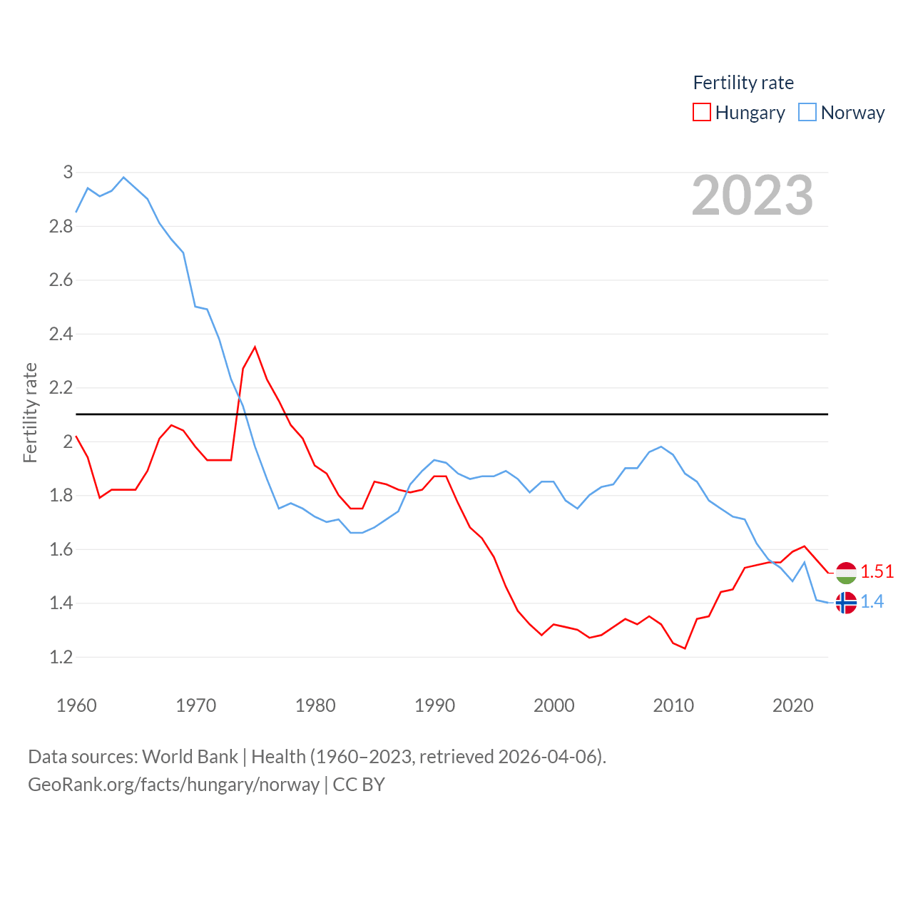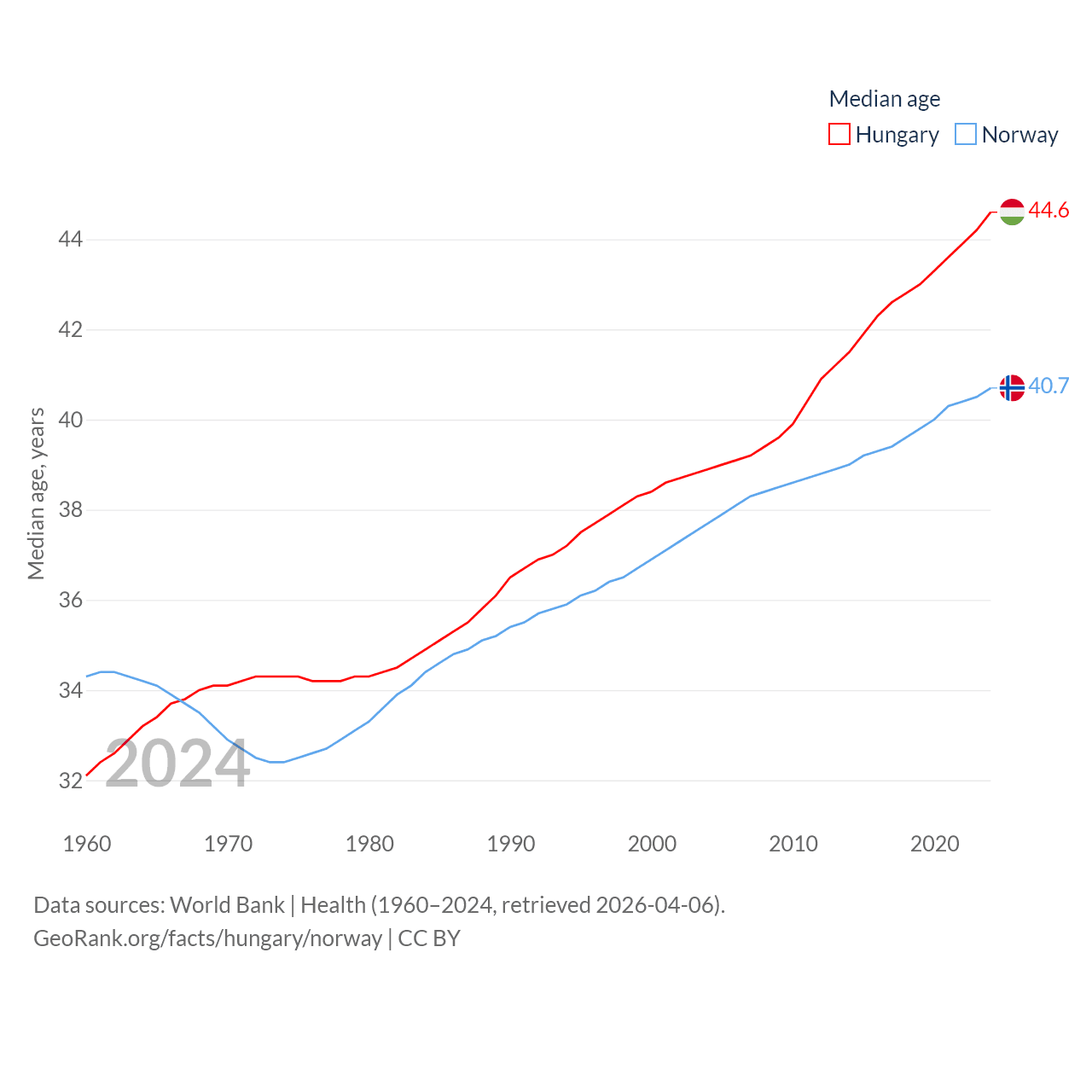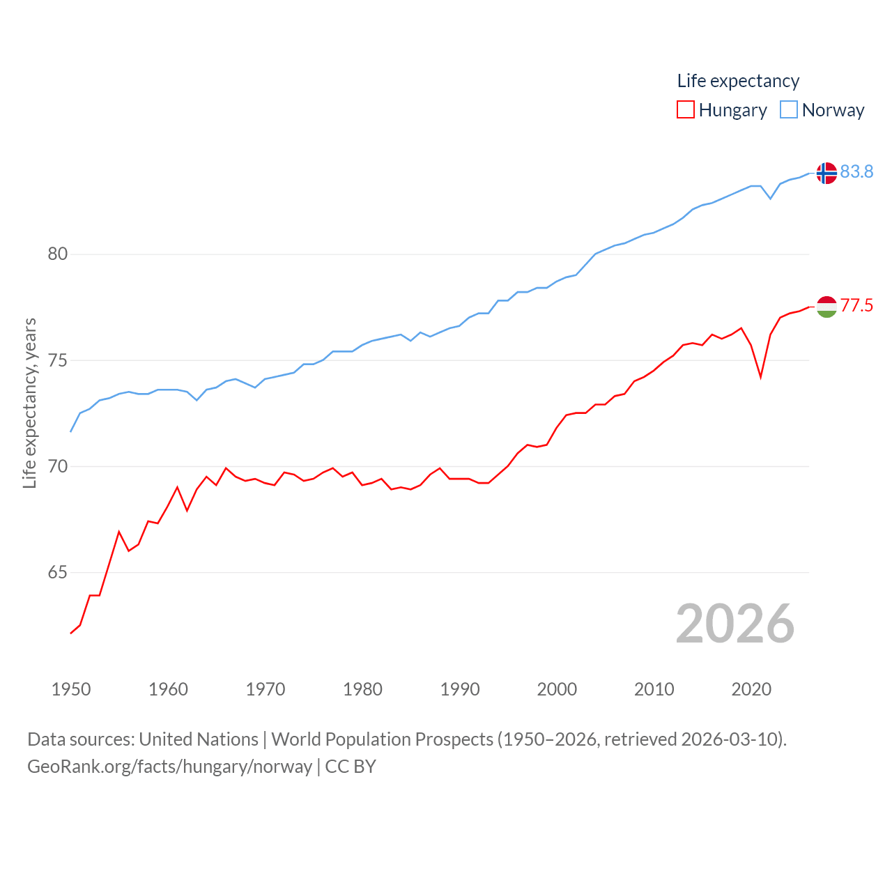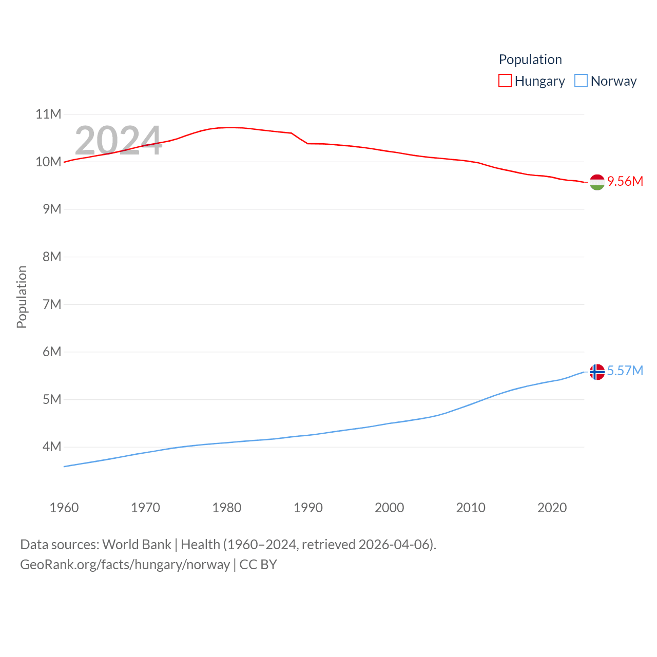 Hungary has a population of 9.56M (ranked 97/197), compared with 5.57M in Norway (ranked 118/197). Hungary's land area is 35,236 sq mi versus 140,645 sq mi for Norway (ranked 109th vs. 62nd).