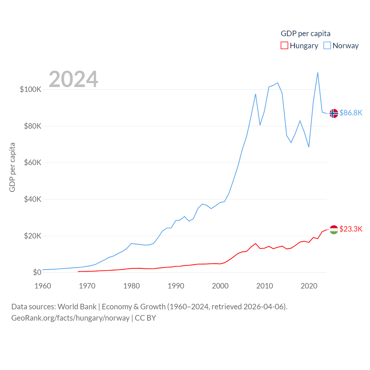 By GDP, Hungary ranks 55/197 ($223B) and Norway ranks 32/197 ($484B). By GDP per capita, Hungary ranks 55/197 ($23,292), while Norway ranks 8/197 ($86,785).