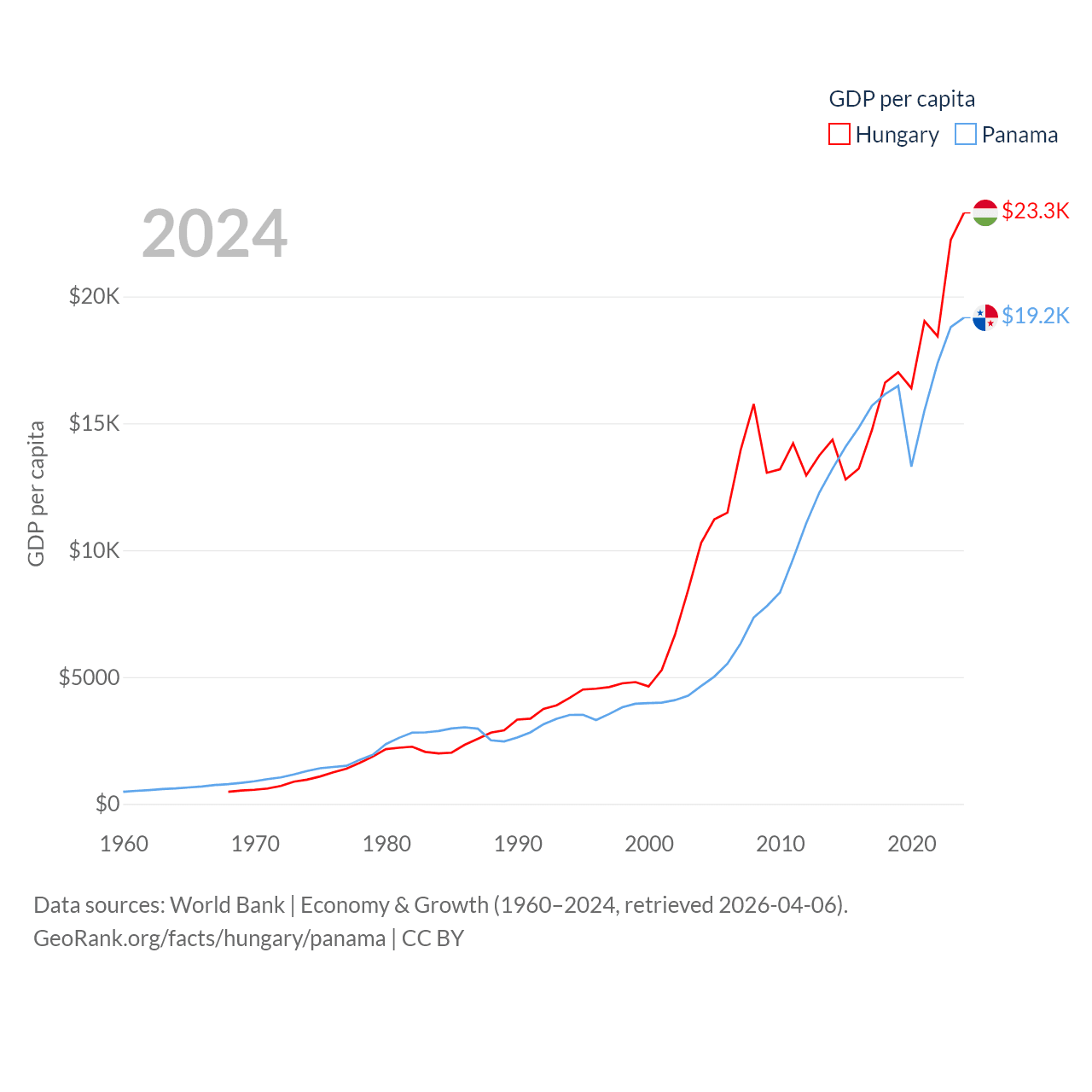 By GDP, Hungary ranks 55/197 ($223B) and Panama ranks 78/197 ($86.5B). By GDP per capita, Hungary ranks 55/197 ($23,292), while Panama ranks 60/197 ($19,161).