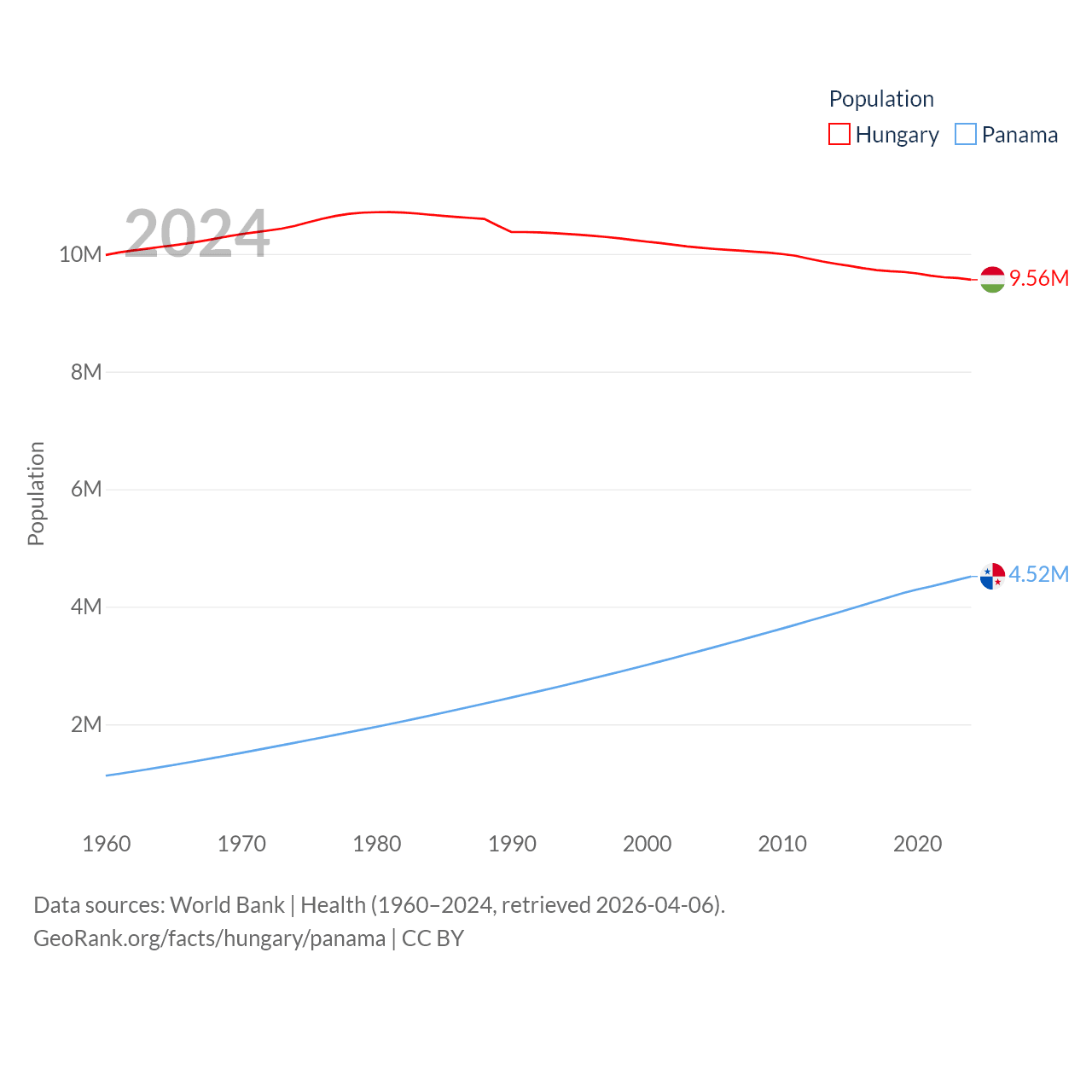 Hungary has a population of 9.56M (ranked 97/197), compared with 4.52M in Panama (ranked 128/197). Hungary's land area is 35,236 sq mi versus 28,641 sq mi for Panama (ranked 109th vs. 115th).