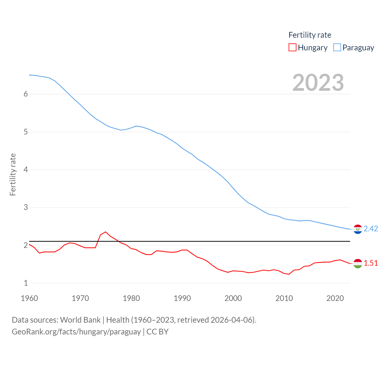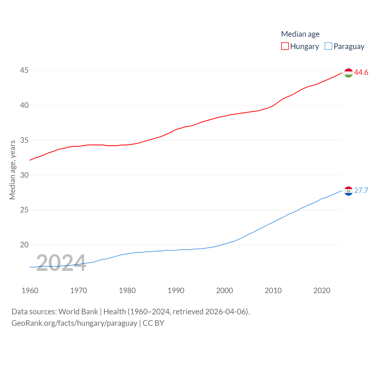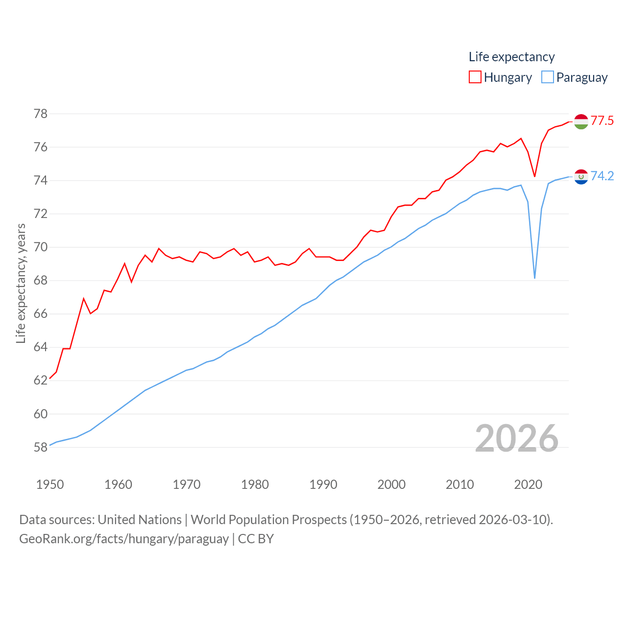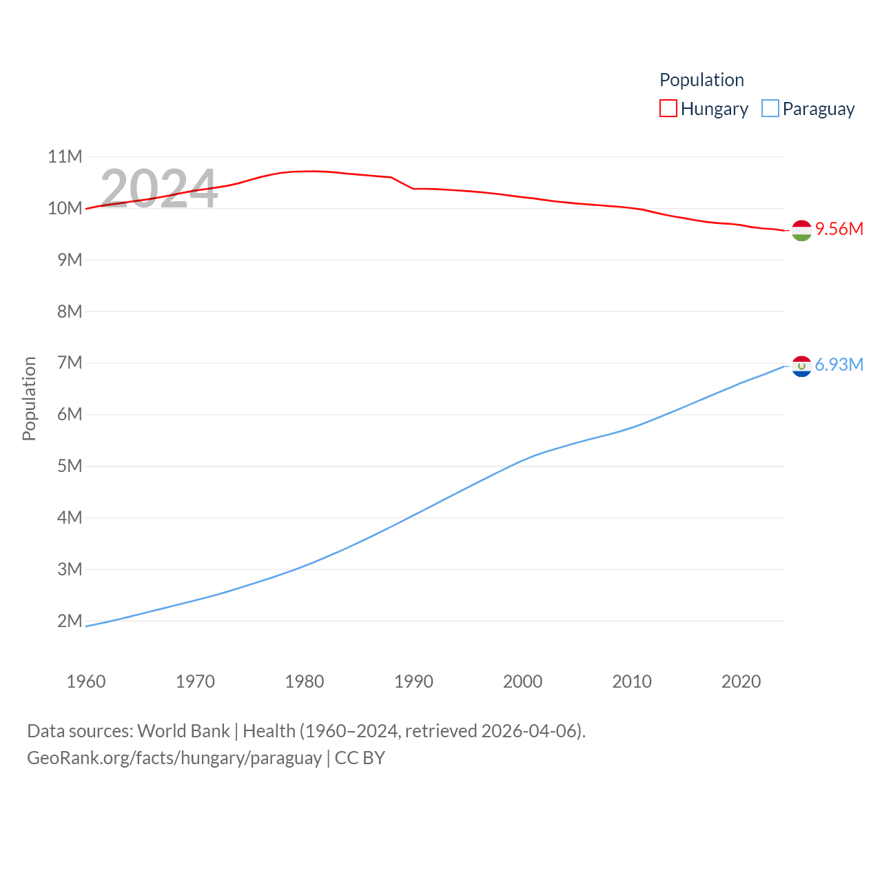 Hungary has a population of 9.56M (ranked 97/197), compared with 6.93M in Paraguay (ranked 107/197). Hungary's land area is 35,236 sq mi versus 152,901 sq mi for Paraguay (ranked 109th vs. 59th).