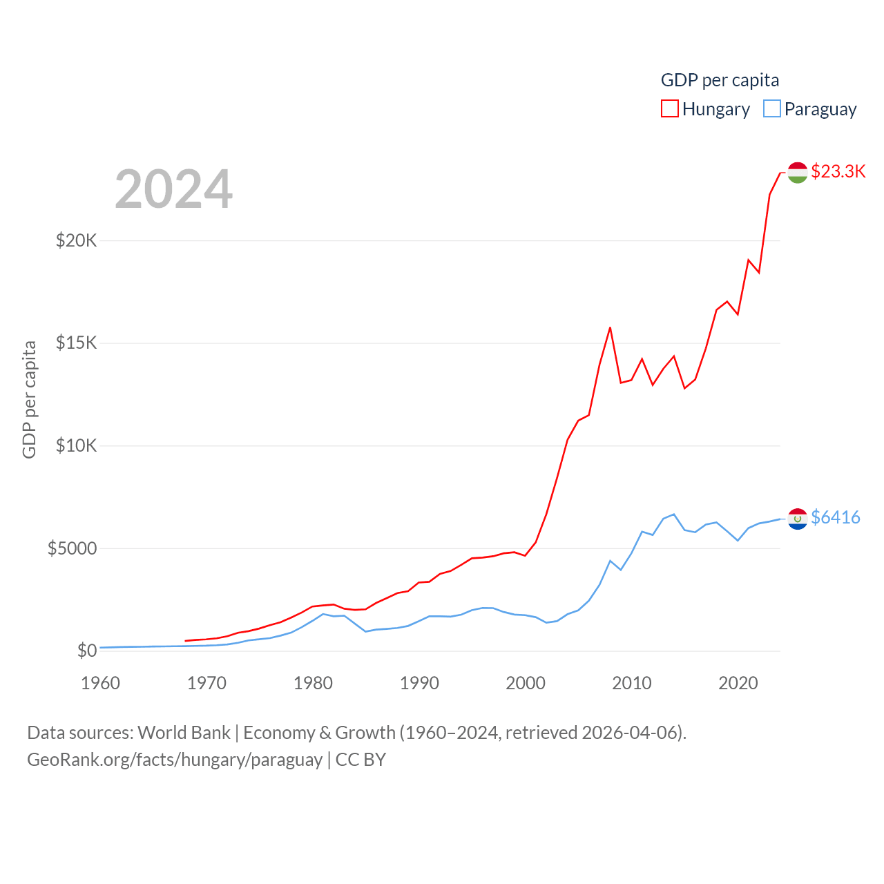 By GDP, Hungary ranks 55/197 ($223B) and Paraguay ranks 98/197 ($44.5B). By GDP per capita, Hungary ranks 55/197 ($23,292), while Paraguay ranks 109/197 ($6,416).