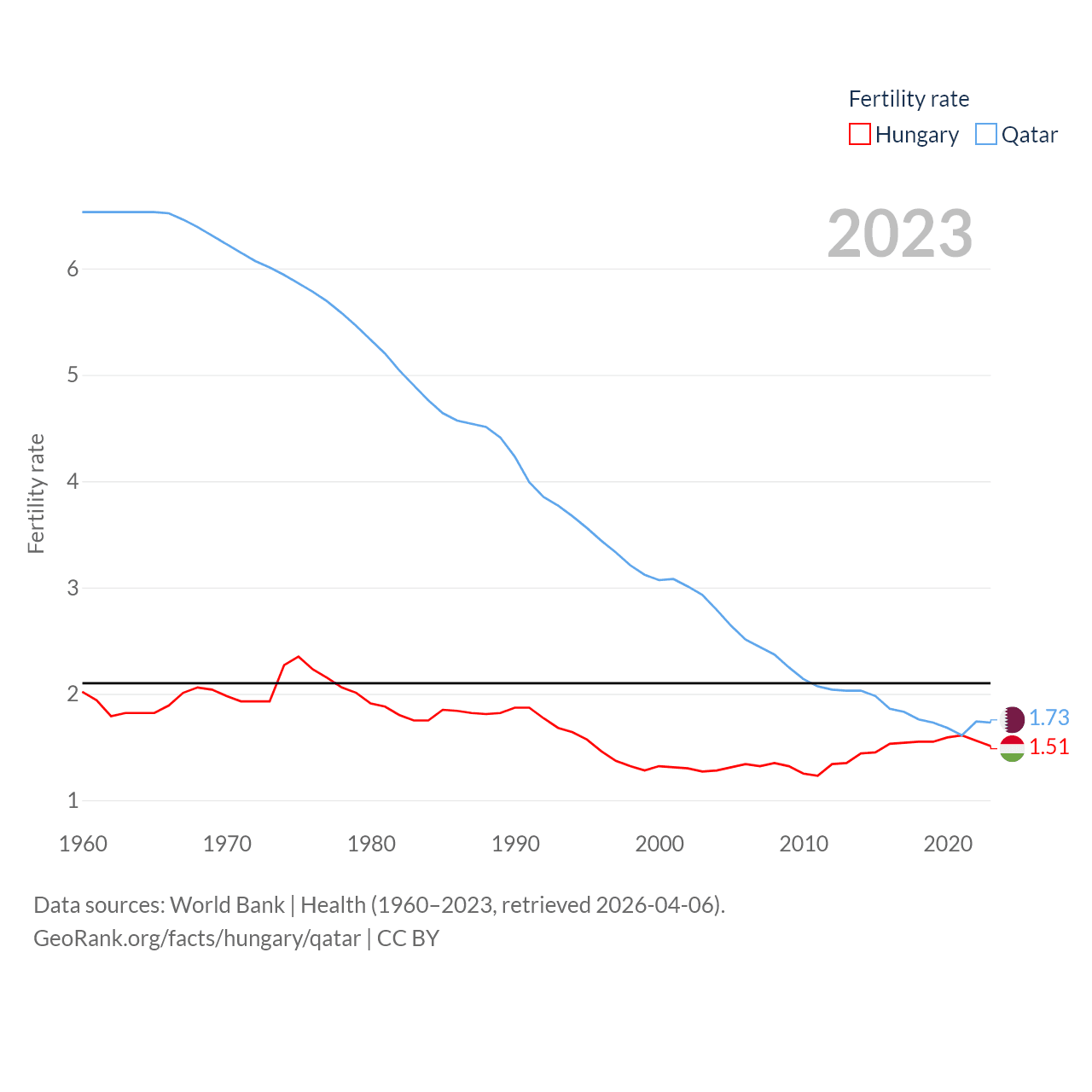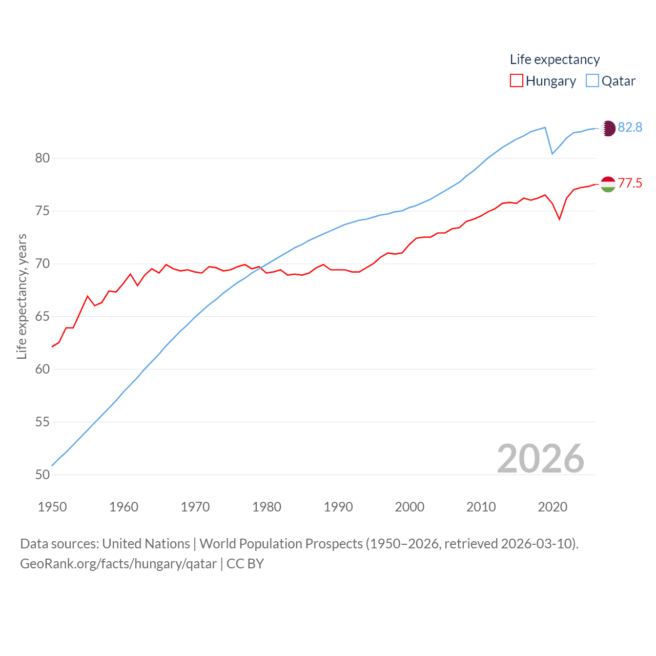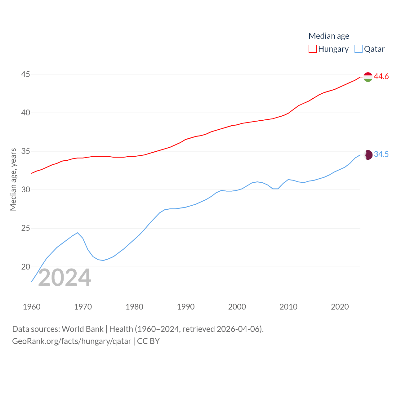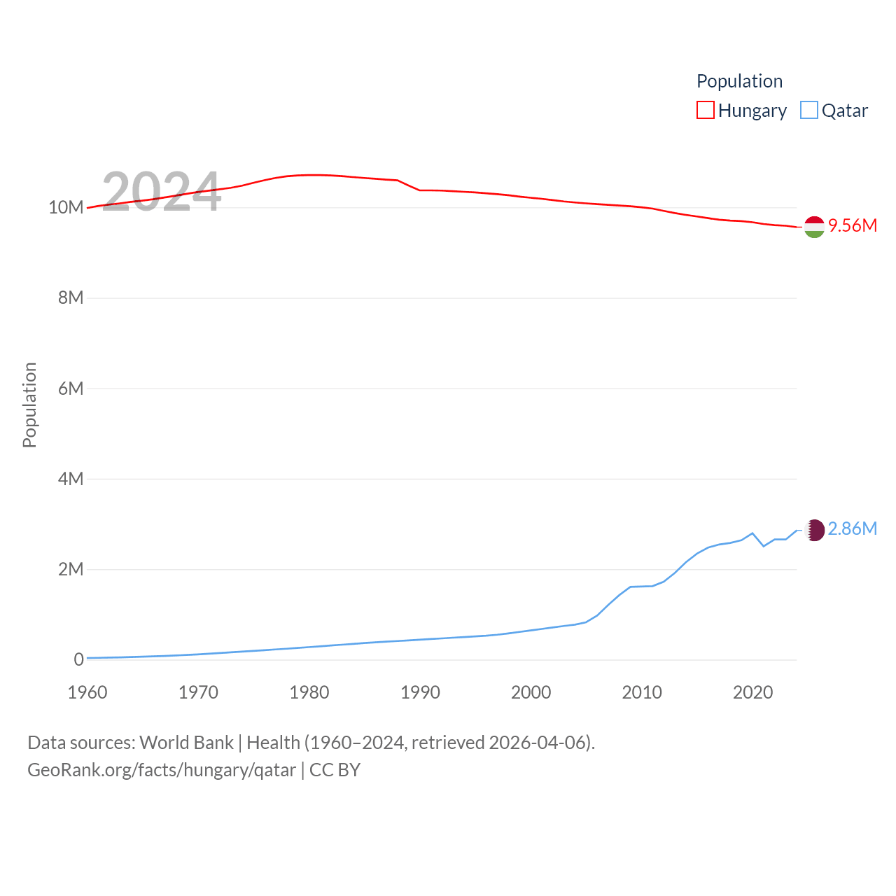 Hungary has a population of 9.56M (ranked 97/197), compared with 2.86M in Qatar (ranked 138/197). Hungary's land area is 35,236 sq mi versus 4,436 sq mi for Qatar (ranked 109th vs. 158th).