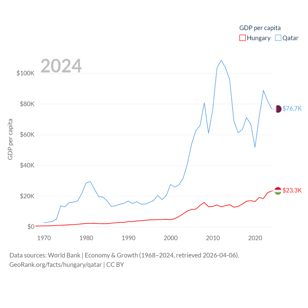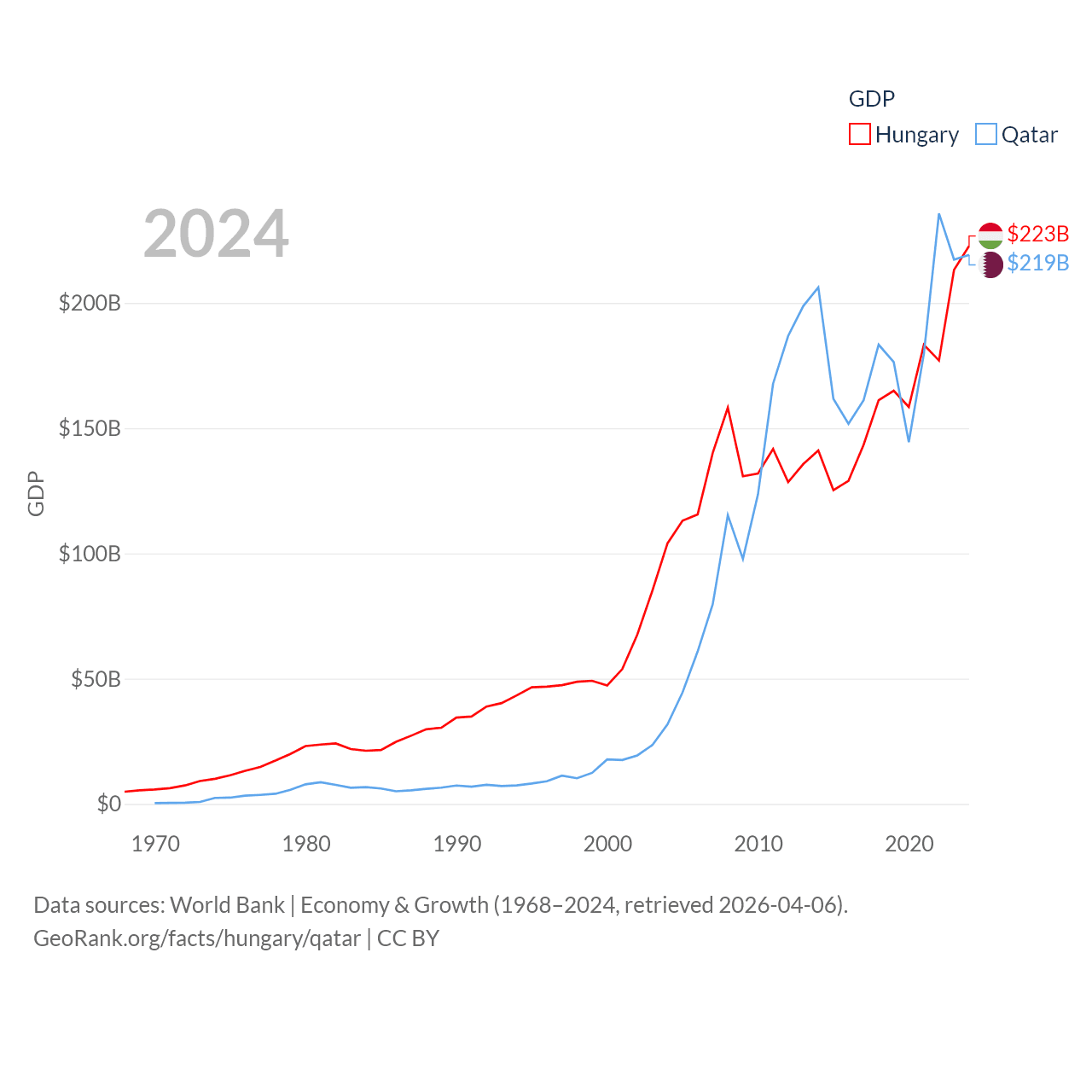By GDP, Hungary ranks 55/197 ($223B) and Qatar ranks 56/197 ($219B). By GDP per capita, Hungary ranks 55/197 ($23,292), while Qatar ranks 11/197 ($76,689).