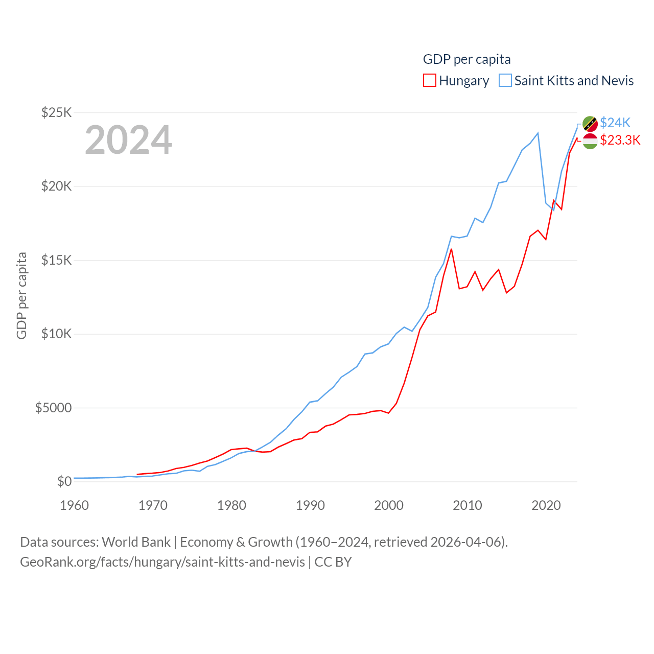 By GDP, Hungary ranks 55/197 ($223B) and Saint Kitts and Nevis ranks 187/197 ($1.12B). By GDP per capita, Hungary ranks 55/197 ($23,292), while Saint Kitts and Nevis ranks 51/197 ($23,961).