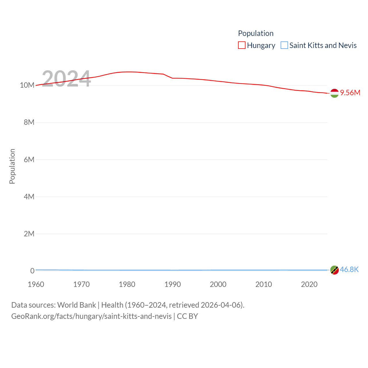 Hungary has a population of 9.56M (ranked 97/197), compared with 46.8K in Saint Kitts and Nevis (ranked 189/197). Hungary's land area is 35,236 sq mi versus 100.4 sq mi for Saint Kitts and Nevis (ranked 109th vs. 189th).