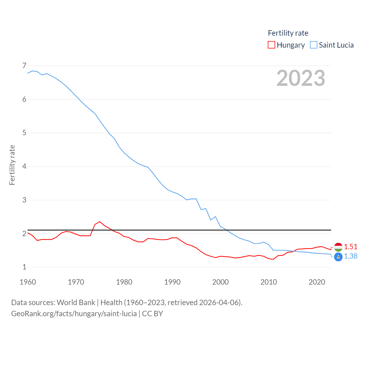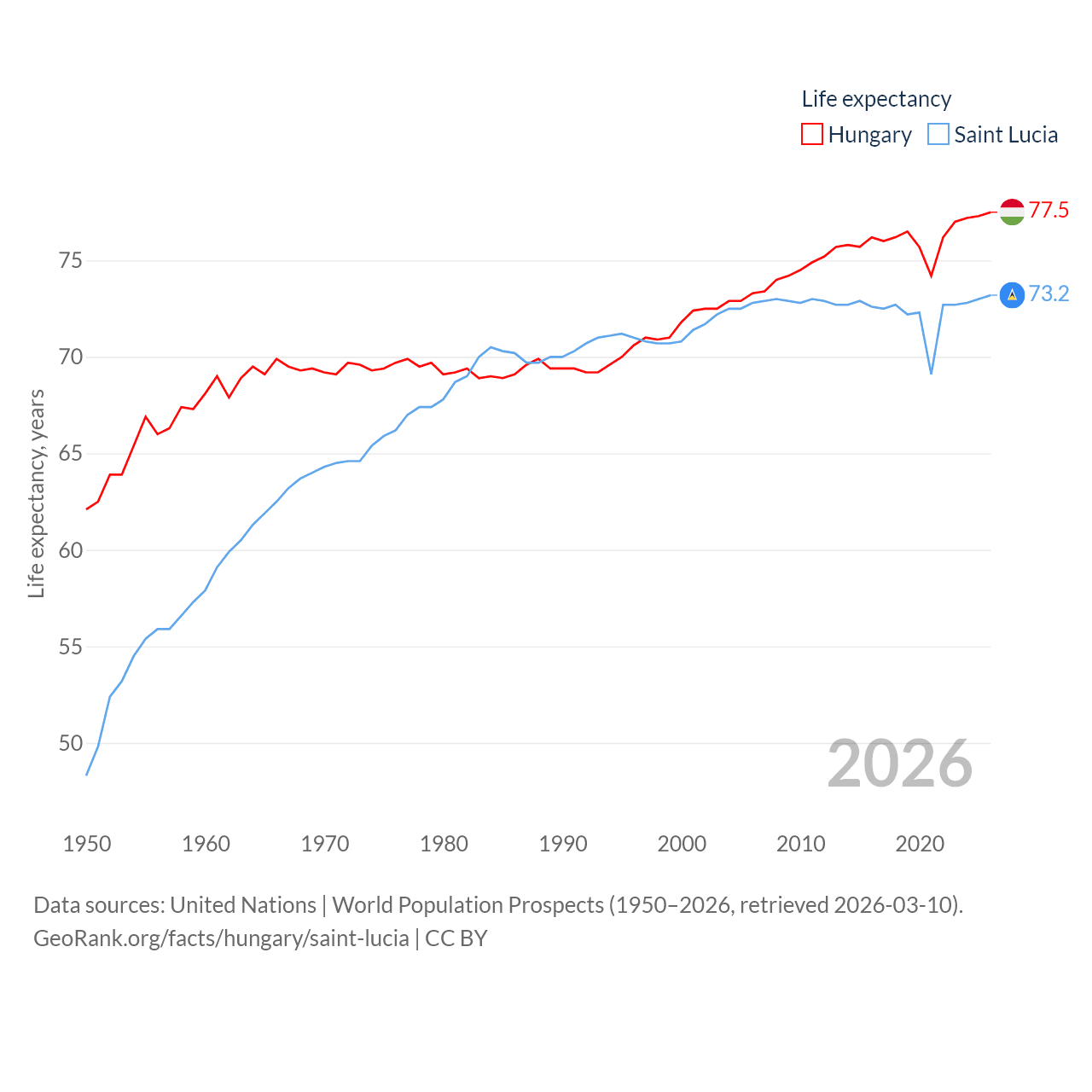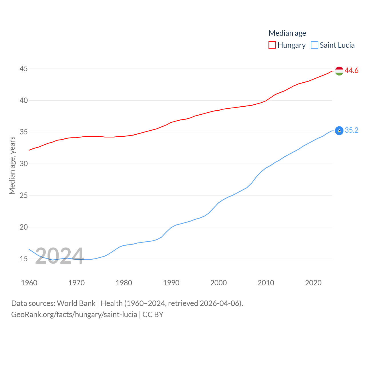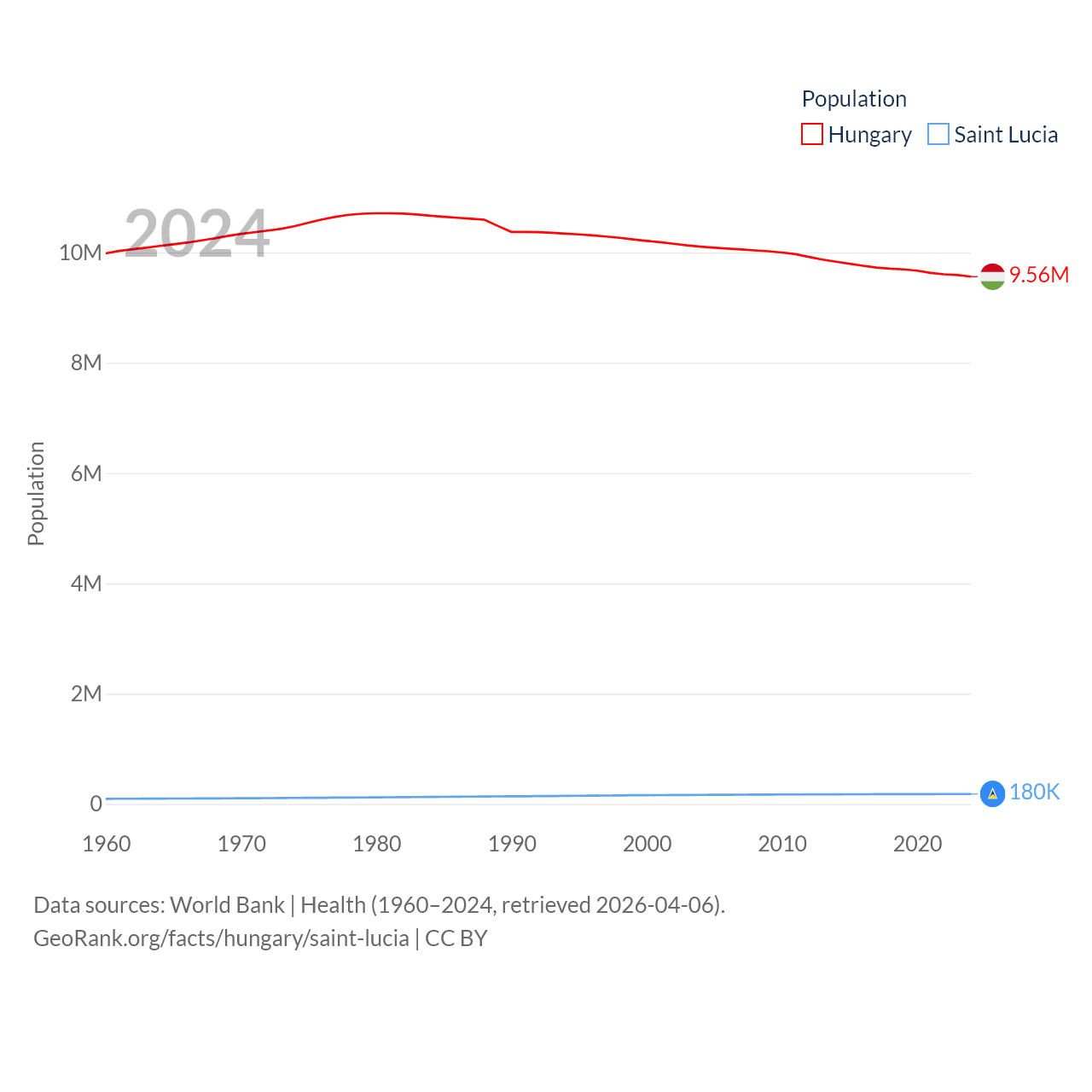 Hungary has a population of 9.56M (ranked 97/197), compared with 180K in Saint Lucia (ranked 178/197). Hungary's land area is 35,236 sq mi versus 235.5 sq mi for Saint Lucia (ranked 109th vs. 178th).