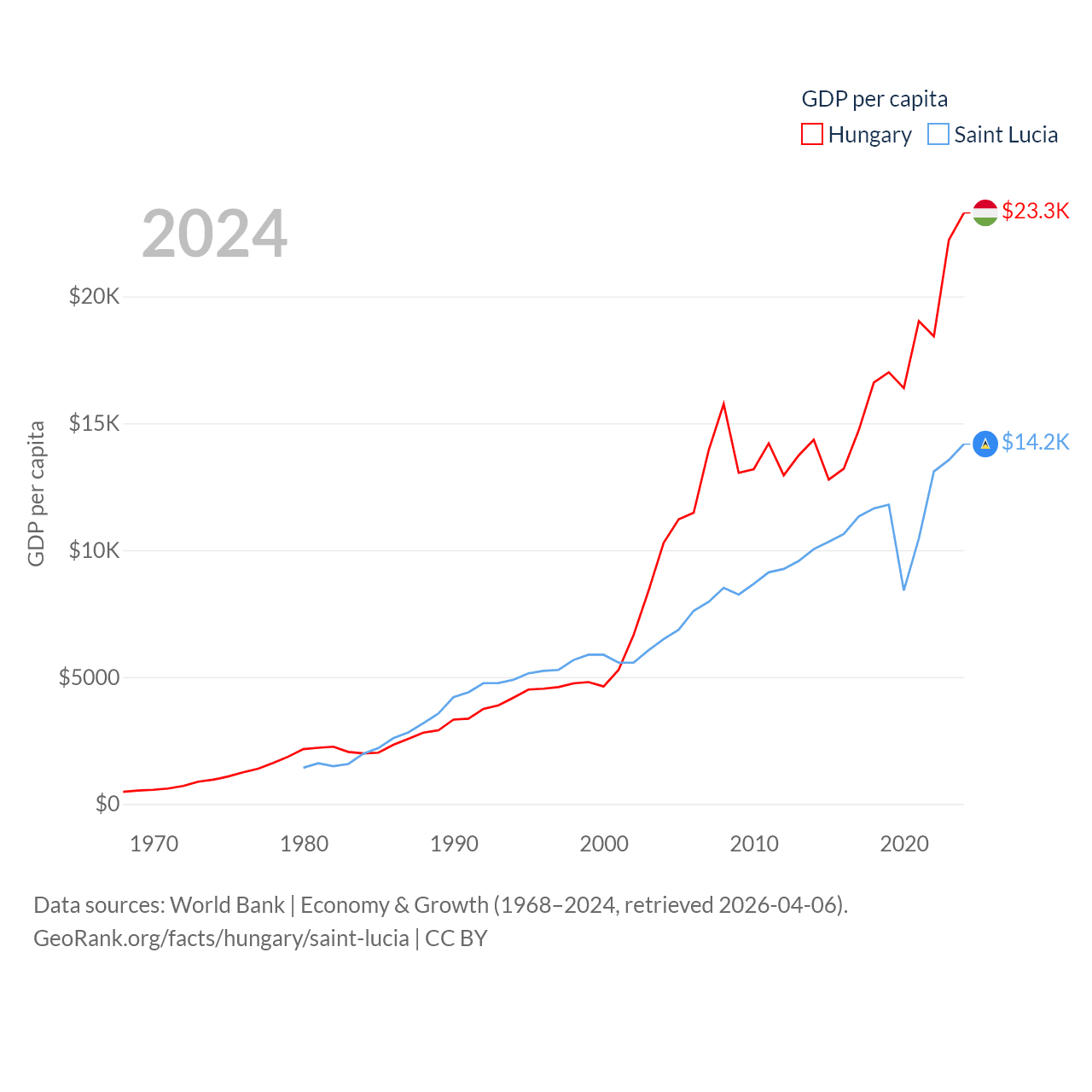 By GDP, Hungary ranks 55/197 ($223B) and Saint Lucia ranks 173/197 ($2.55B). By GDP per capita, Hungary ranks 55/197 ($23,292), while Saint Lucia ranks 70/197 ($14,182).